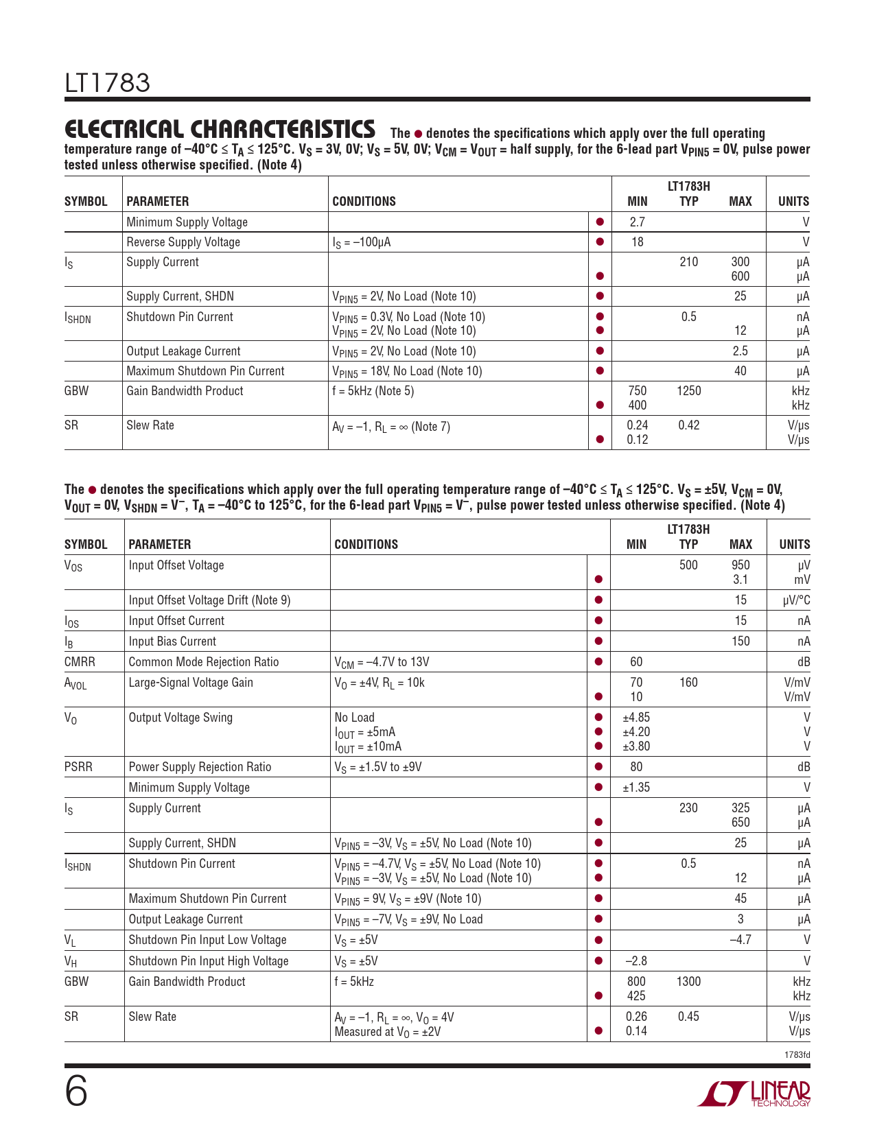 denotes the specifi cations which apply over the full operating temperature range of –40°C ≤ TA ≤ 125°C. VS = ±5V, VCM = 0V, VOUT = 0V, VSHDN = V–, TA = –40°C to 125°C, for the 6-lead part VPIN5 = V–, pulse power tested unless otherwise specifi ed. (Note 4) LT1783H SYMBOL PARAMETER CONDITIONS MIN TYP MAX UNITS
