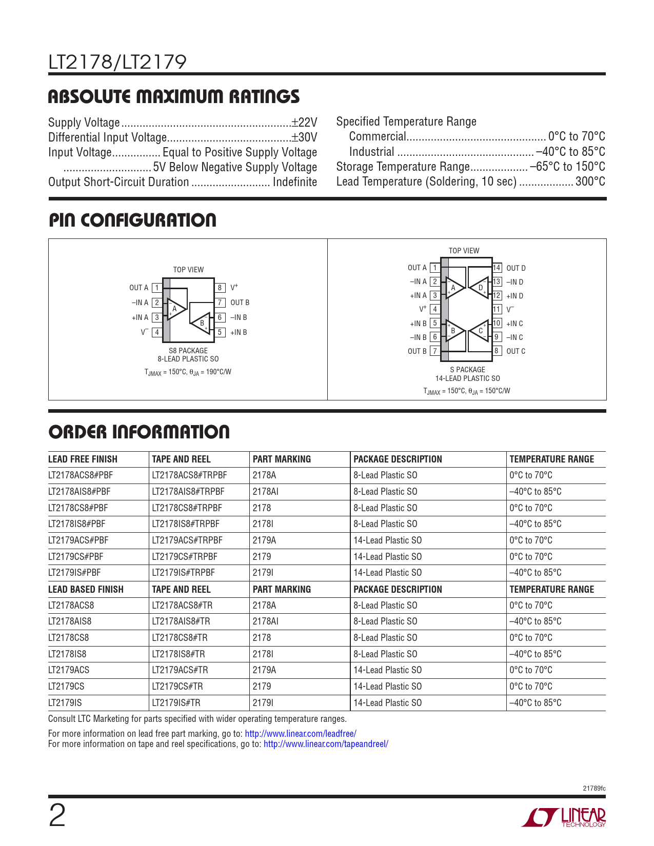 LT2178ACS8 LT2178ACS8#TR 2178A 8-Lead Plastic SO 0°C to 70°C LT2178AIS8 LT2178AIS8#TR 2178AI 8-Lead Plastic SO –40°C to 85°C LT2178CS8 LT2178CS8#TR 2178 8-Lead Plastic SO 0°C to 70°C LT2178IS8 LT2178IS8#TR 2178I 8-Lead Plastic SO –40°C to 85°C LT2179ACS LT2179ACS#TR 2179A 14-Lead Plastic SO 0°C to 70°C LT2179CS LT2179CS#TR 2179 14-Lead Plastic SO 0°C to 70°C LT2179IS LT2179IS#TR 2179I 14-Lead Plastic SO –40°C to 85°C Consult LTC Marketing for parts specifi ed with wider operating temperature ranges. For more information on lead free part marking, go to: http://www.linear.com/leadfree/ For more information on tape and reel specifi cations, go to: http://www.linear.com/tapeandreel/ 21789fc 2