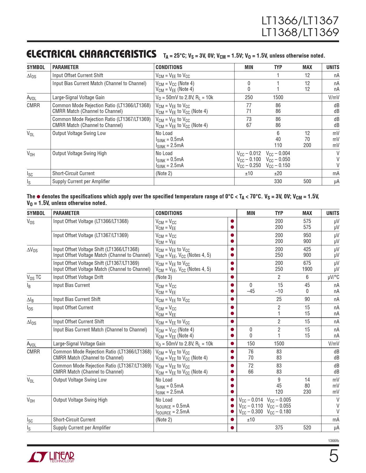 ∆IOS Input Offset Current Shift VCM = VEE to VCC 1 12 nA Input Bias Current Match (Channel to Channel) VCM = VCC (Note 4) 0 1 12 nA VCM = VEE (Note 4) 0 1 12 nA AVOL Large-Signal Voltage Gain VO = 50mV to 2.8V, RL = 10k 250 1500 V/mV CMRR Common Mode Rejection Ratio (LT1366/LT1368) VCM = VEE to VCC 77 86 dB CMRR Match (Channel to Channel) VCM = VEE to VCC (Note 4) 71 86 dB Common Mode Rejection Ratio (LT1367/LT1369) VCM = VEE to VCC 73 86 dB CMRR Match (Channel to Channel) VCM = VEE to VCC (Note 4) 67 86 dB VOL Output Voltage Swing Low No Load 6 12 mV ISINK = 0.5mA 40 70 mV ISINK = 2.5mA 110 200 mV VOH Output Voltage Swing High No Load VCC – 0.012 VCC – 0.004 V ISINK = 0.5mA VCC – 0.100 VCC – 0.050 V ISINK = 2.5mA VCC – 0.250 VCC – 0.150 V ISC Short-Circuit Current (Note 2) ±10 ±20 mA IS Supply Current per Amplifier 330 500 µA