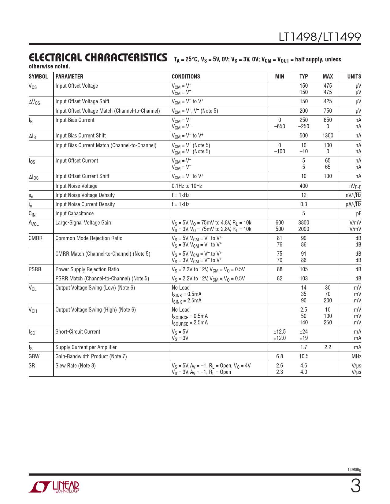VOS Input Offset Voltage VCM = V+ 150 475 μV VCM = V– 150 475 μV ΔVOS Input Offset Voltage Shift VCM = V– to V+ 150 425 μV Input Offset Voltage Match (Channel-to-Channel) VCM = V+, V– (Note 5) 200 750 μV IB Input Bias Current VCM = V+ 0 250 650 nA VCM = V– –650 –250 0 nA ΔIB Input Bias Current Shift VCM = V– to V+ 500 1300 nA Input Bias Current Match (Channel-to-Channel) VCM = V+ (Note 5) 0 10 100 nA VCM = V– (Note 5) –100 –10 0 nA IOS Input Offset Current VCM = V+ 5 65 nA VCM = V– 5 65 nA ΔIOS Input Offset Current Shift VCM = V– to V+ 10 130 nA Input Noise Voltage 0.1Hz to 10Hz 400 nVP-P en Input Noise Voltage Density f = 1kHz 12 nV/√Hz in Input Noise Current Density f = 1kHz 0.3 pA/√Hz CIN Input Capacitance 5 pF AVOL Large-Signal Voltage Gain VS = 5V, VO = 75mV to 4.8V, RL = 10k 600 3800 V/mV VS = 3V, VO = 75mV to 2.8V, RL = 10k 500 2000 V/mV CMRR Common Mode Rejection Ratio VS = 5V, VCM = V– to V+ 81 90 dB VS = 3V, VCM = V– to V+ 76 86 dB CMRR Match (Channel-to-Channel) (Note 5) VS = 5V, VCM = V– to V+ 75 91 dB VS = 3V, VCM = V– to V+ 70 86 dB PSRR Power Supply Rejection Ratio VS = 2.2V to 12V, VCM = VO = 0.5V 88 105 dB PSRR Match (Channel-to-Channel) (Note 5) VS = 2.2V to 12V, VCM = VO = 0.5V 82 103 dB VOL Output Voltage Swing (Low) (Note 6) No Load 14 30 mV ISINK = 0.5mA 35 70 mV ISINK = 2.5mA 90 200 mV VOH Output Voltage Swing (High) (Note 6) No Load 2.5 10 mV ISOURCE = 0.5mA 50 100 mV ISOURCE = 2.5mA 140 250 mV ISC Short-Circuit Current VS = 5V ±12.5 ±24 mA VS = 3V ±12.0 ±19 mA IS Supply Current per Amplifi er 1.7 2.2 mA GBW Gain-Bandwidth Product (Note 7) 6.8 10.5 MHz SR Slew Rate (Note 8) VS = 5V, AV = –1, RL = Open, VO = 4V 2.6 4.5 V/μs VS = 3V, AV = –1, RL = Open 2.3 4.0 V/μs 14989fg 3