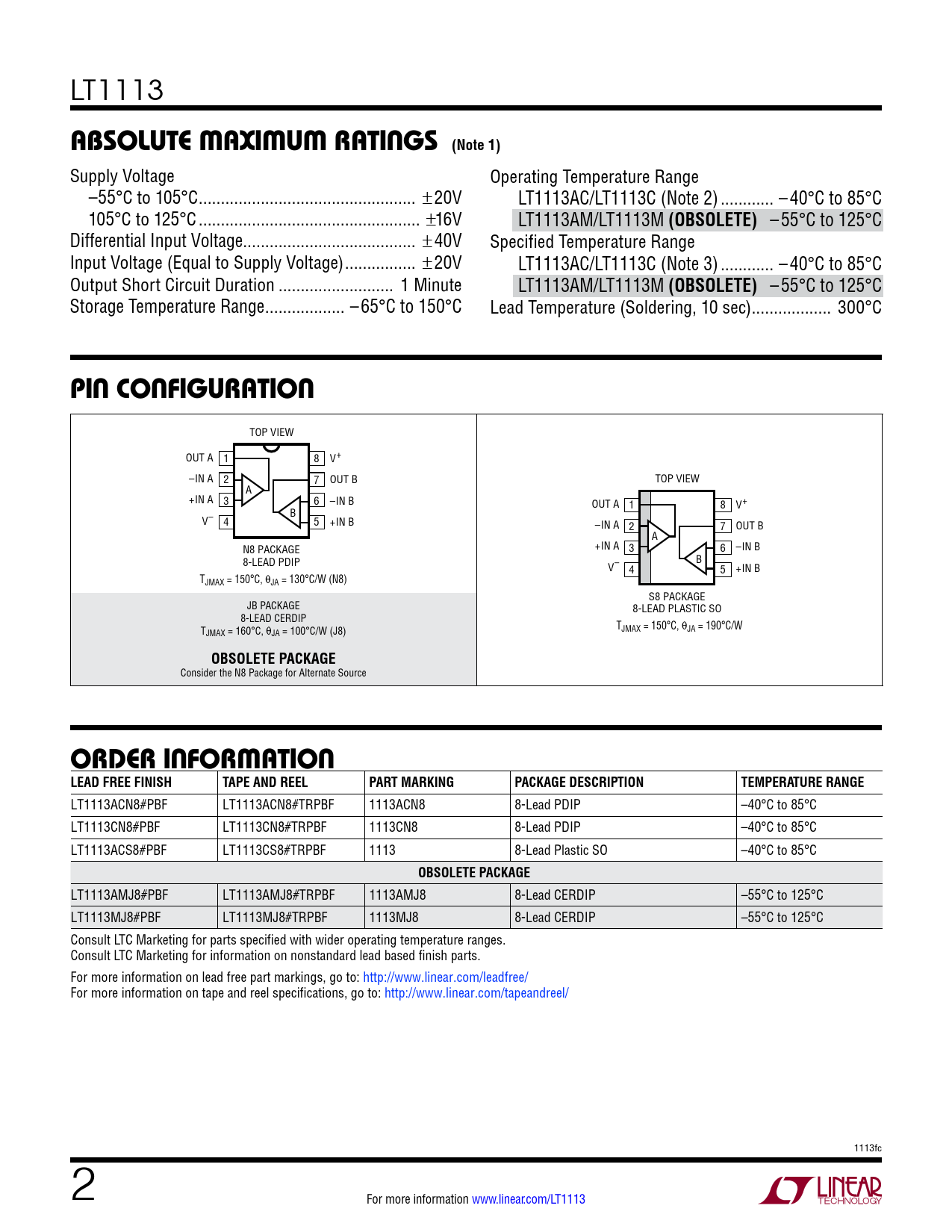 LT1113ACN8#PBF LT1113ACN8#TRPBF 1113ACN8 8-Lead PDIP –40°C to 85°C LT1113CN8#PBF LT1113CN8#TRPBF 1113CN8 8-Lead PDIP –40°C to 85°C LT1113ACS8#PBF LT1113CS8#TRPBF 1113 8-Lead Plastic SO –40°C to 85°C
