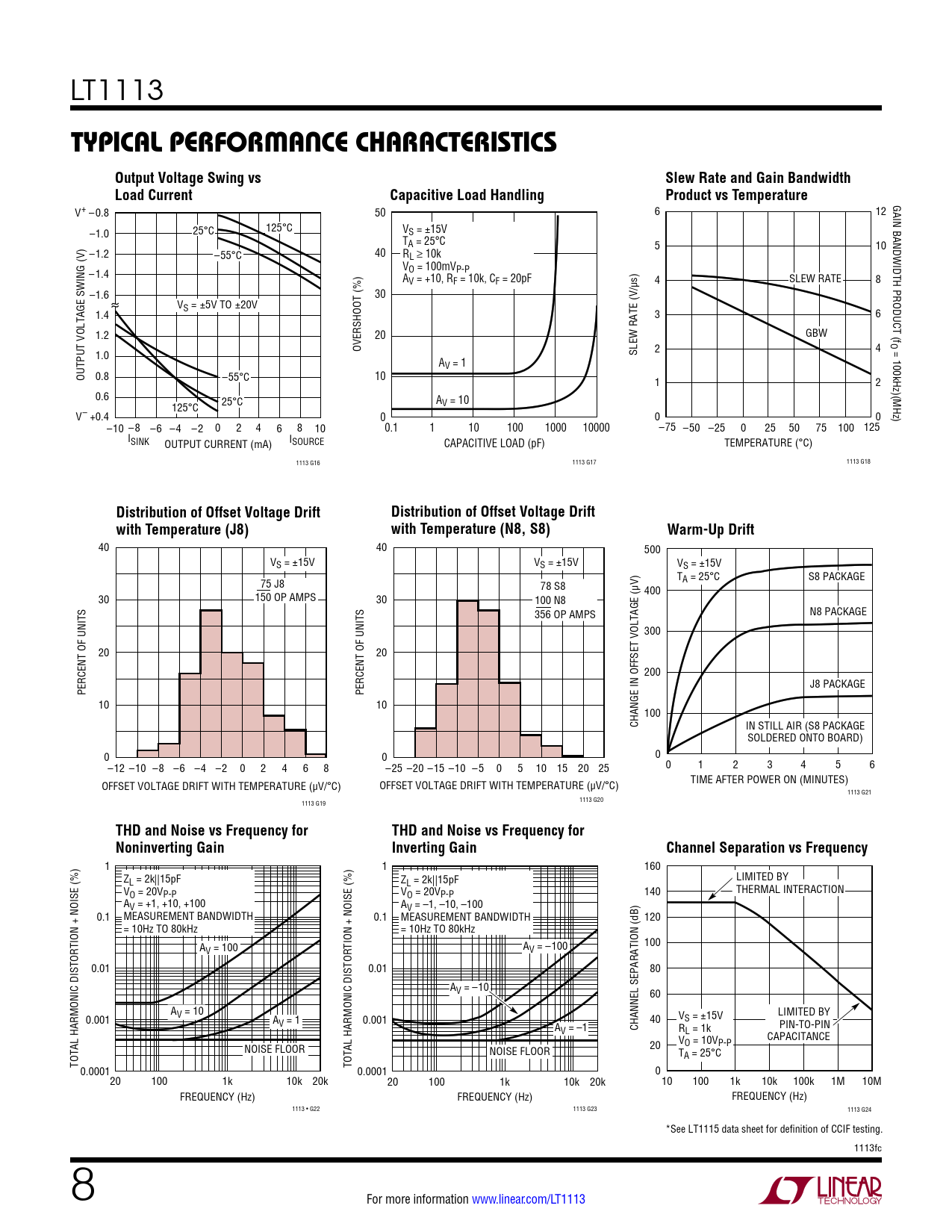 LT1113 Typical perForMance characTerisTicsOutput Voltage Swing vsSlew Rate and Gain BandwidthLoad CurrentCapacitive Load HandlingProduct vs Temperature GAIN BANDWIDTH PRODUCT (f V+ –0.8 50 6 12 –1.0 25°C 125°C VS = ±15V TA = 25°C 5 10 –1.2 –55°C 40 RL ≥ 10k V –1.4 O = 100mVP-P AV = +10, RF = 10k, CF = 20pF 4 SLEW RATE 8 –1.6 30 VS = ±5V TO ±20V 1.4 3 6 1.2 20 GBW O OVERSHOOT (%) 2 4 = 100kHz)(MHz) 1.0 SLEW RATE (V/µs) AV = 1 OUTPUT VOLTAGE SWING (V) 0.8 –55°C 10 1 2 0.6 25°C A 125°C V = 10 V– +0.4 0 0 0 –10 –8 –6 –4 –2 0 2 4 6 8 10 0.1 1 10 100 1000 10000 –75 –50 –25 0 25 50 75 100 125 ISINK OUTPUT CURRENT (mA) ISOURCE CAPACITIVE LOAD (pF) TEMPERATURE (°C) 1113 G16 1113 G17 1113 G18 Distribution of Offset Voltage DriftDistribution of Offset Voltage Driftwith Temperature (J8)with Temperature (N8, S8)Warm-Up Drift 40 40 500 VS = ±15V VS = ±15V VS = ±15V T 75 J8 78 S8 A = 25°C S8 PACKAGE 400 30 150 OP AMPS 30 100 N8 356 OP AMPS N8 PACKAGE 300 20 20 200 J8 PACKAGE PERCENT OF UNITS PERCENT OF UNITS 10 10 100 CHANGE IN OFFSET VOLTAGE (µV) IN STILL AIR (S8 PACKAGE SOLDERED ONTO BOARD) 0 0 0 –12 –10 –8 –6 –4 –2 0 2 4 6 8 –25 –20 –15 –10 –5 0 5 10 15 20 25 0 1 2 3 4 5 6 TIME AFTER POWER ON (MINUTES) OFFSET VOLTAGE DRIFT WITH TEMPERATURE (µV/°C) OFFSET VOLTAGE DRIFT WITH TEMPERATURE (µV/°C) 1113 G21 1113 G20 1113 G19 THD and Noise vs Frequency forTHD and Noise vs Frequency forNoninverting GainInverting GainChannel Separation vs Frequency 1 1 160 Z LIMITED BY L = 2k||15pF ZL = 2k||15pF V THERMAL INTERACTION O = 20VP-P VO = 20VP-P 140 AV = +1, +10, +100 AV = –1, –10, –100 0.1 MEASUREMENT BANDWIDTH 0.1 MEASUREMENT BANDWIDTH 120 = 10Hz TO 80kHz = 10Hz TO 80kHz A 100 V = 100 AV = –100 0.01 0.01 80 AV = –10 60 A LIMITED BY 0.001 V = 10 A V V = 1 0.001 40 S = ±15V A PIN-TO-PIN V = –1 CHANNEL SEPARATION (dB) RL = 1k V CAPACITANCE NOISE FLOOR O = 10VP-P NOISE FLOOR 20 TA = 25°C TOTAL HARMONIC DISTORTION + NOISE (%) TOTAL HARMONIC DISTORTION + NOISE (%) 0.0001 0.0001 0 20 100 1k 10k 20k 20 100 1k 10k 20k 10 100 1k 10k 100k 1M 10M FREQUENCY (Hz) FREQUENCY (Hz) FREQUENCY (Hz) 1113 • G22 1113 G23 1113 G24 *See LT1115 data sheet for definition of CCIF testing. 1113fc 8 For more information www.linear.com/LT1113