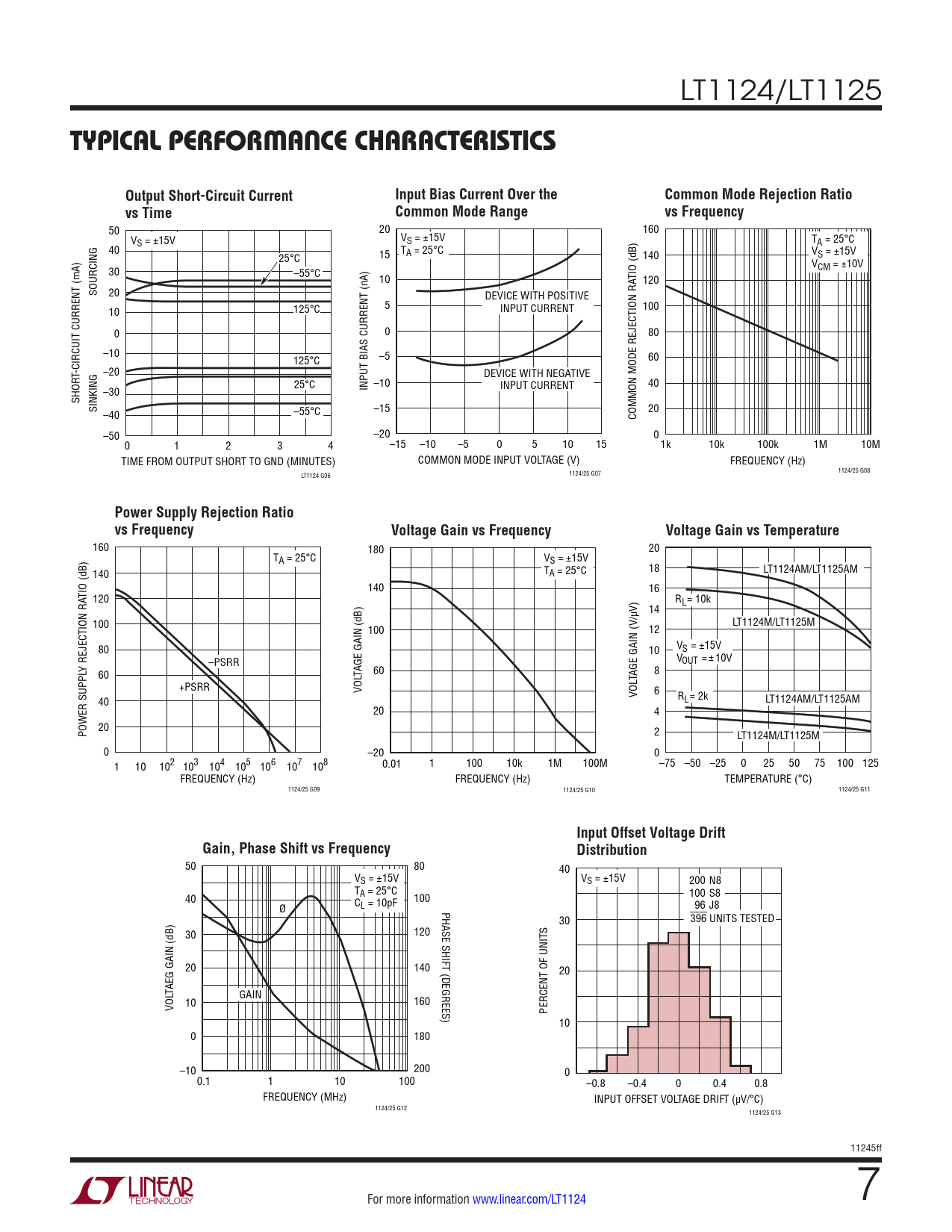 LT1124/LT1125 Typical perForMance characTerisTicsOutput Short-Circuit CurrentInput Bias Current Over theCommon Mode Rejection Ratiovs TimeCommon Mode Rangevs Frequency 50 20 160 VS = ±15V VS = ±15V TA = 25°C 40 T V 25°C 15 A = 25°C 140 S = ±15V V 30 –55°C CM = ±10V 10 TIO (dB) 120 SOURCING 20 DEVICE WITH POSITIVE 10 125°C 5 INPUT CURRENT 100 0 0 80 –10 125°C –5 60 T-CIRCUIT CURRENT (mA) –20 DEVICE WITH NEGATIVE 25°C 40 –30 INPUT BIAS CURRENT (nA) –10 INPUT CURRENT SHOR SINKING –40 –55°C –15 20 COMMON MODE REJECTION RA –50 –20 0 0 1 2 3 4 –15 –10 –5 0 5 10 15 1k 10k 100k 1M 10M TIME FROM OUTPUT SHORT TO GND (MINUTES) COMMON MODE INPUT VOLTAGE (V) FREQUENCY (Hz) 1124/25 G08 LT1124 G06 1124/25 G07 Power Supply Rejection Ratiovs FrequencyVoltage Gain vs FrequencyVoltage Gain vs Temperature 160 180 20 TA = 25°C VS = ±15V 140 TA = 25°C 18 LT1124AM/LT1125AM TIO (dB) 140 16 120 R = 10k V) 14 L /µ 100 LT1124M/LT1125M 100 12 80 10 V = 15V S ± V = 10V ± OUT Y REJECTION RA –PSRR 60 TAGE GAIN (dB) 60 TAGE GAIN (V 8 +PSRR VOL VOL 6 40 L R = 2k LT1124AM/LT1125AM 20 4 POWER SUPPL 20 2 LT1124M/LT1125M 0 –20 0 1 10 102 103 104 105 106 107 108 0.01 1 100 10k 1M 100M –75 –50 –25 0 25 50 75 100 125 FREQUENCY (Hz) FREQUENCY (Hz) TEMPERATURE (°C) 1124/25 G09 1124/25 G10 1124/25 G11 Input Offset Voltage DriftGain, Phase Shift vs FrequencyDistribution 50 80 40 VS = ±15V VS = ±15V 200 N8 T 40 A = 25°C 100 100 S8 Ø CL = 10pF PHASE SHIF 96 J8 30 396 UNITS TESTED 30 120 20 T (DEGREES) 140 20 TAEG GAIN (dB) GAIN VOL 10 160 PERCENT OF UNITS 10 0 180 –10 200 0 0.1 1 10 100 –0.8 –0.4 0 0.4 0.8 FREQUENCY (MHz) INPUT OFFSET VOLTAGE DRIFT (µV/°C) 1124/25 G12 1124/25 G13 11245ff For more information www.linear.com/LT1124 7 Document Outline Features Applications Description Typical Application Absolute Maximum Ratings Pin Configuration Order Information Electrical Characteristics Typical Performance Characteristics Applications Information Performance Comparison Typical Applications Schematic Diagram Package Description Revision History Typical Application Related Parts
