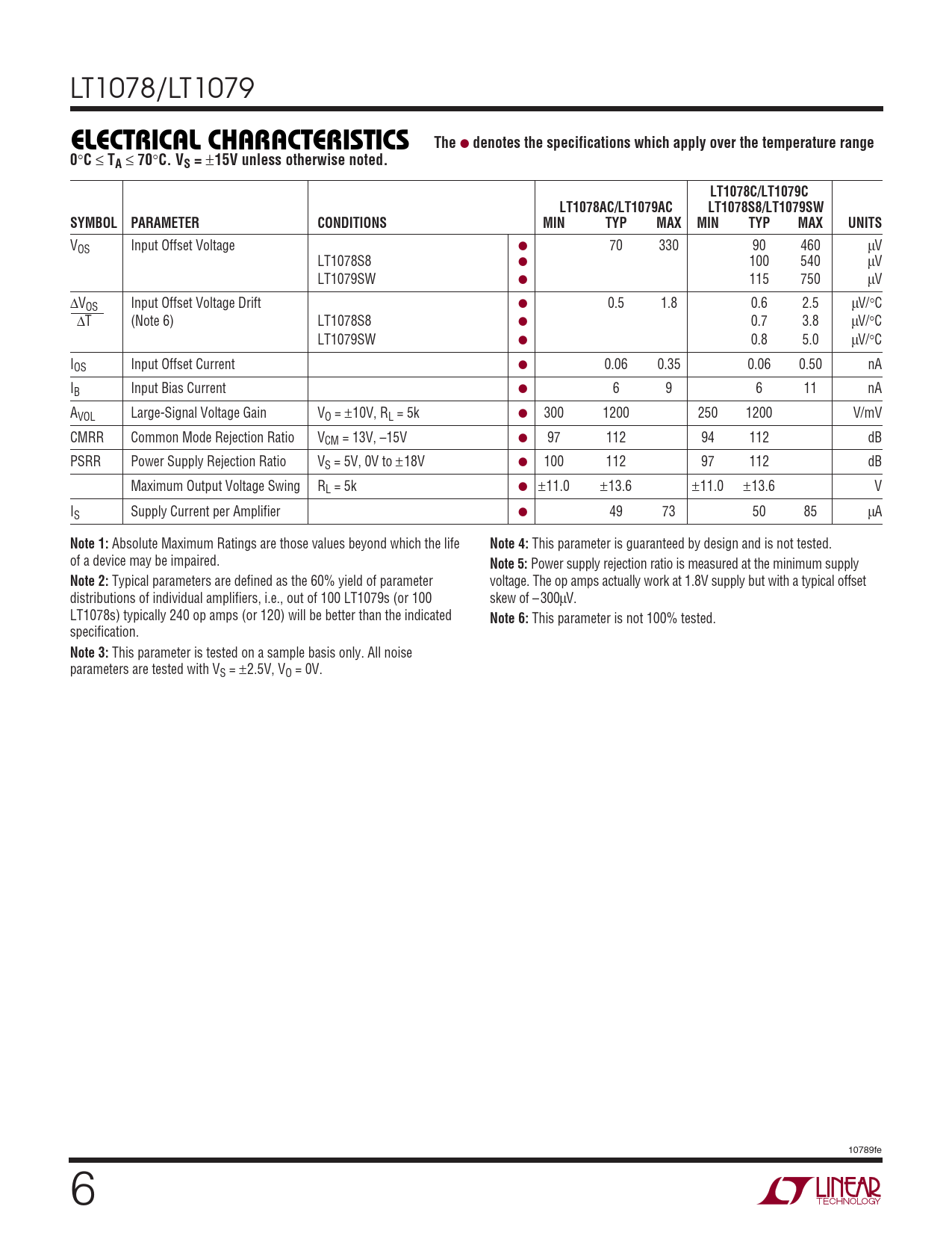 VOS Input Offset Voltage ● 70 330 90 460 μV LT1078S8 ● 100 540 μV LT1079SW ● 115 750 μV ΔVOS Input Offset Voltage Drift ● 0.5 1.8 0.6 2.5 μV/°C ΔT (Note 6) LT1078S8 ● 0.7 3.8 μV/°C LT1079SW ● 0.8 5.0 μV/°C IOS Input Offset Current ● 0.06 0.35 0.06 0.50 nA IB Input Bias Current ● 6 9 6 11 nA AVOL Large-Signal Voltage Gain VO = ±10V, RL = 5k ● 300 1200 250 1200 V/mV CMRR Common Mode Rejection Ratio VCM = 13V, –15V ● 97 112 94 112 dB PSRR Power Supply Rejection Ratio VS = 5V, 0V to ±18V ● 100 112 97 112 dB Maximum Output Voltage Swing RL = 5k ● ±11.0 ±13.6 ±11.0 ±13.6 V IS Supply Current per Amplifier ● 49 73 50 85 μA