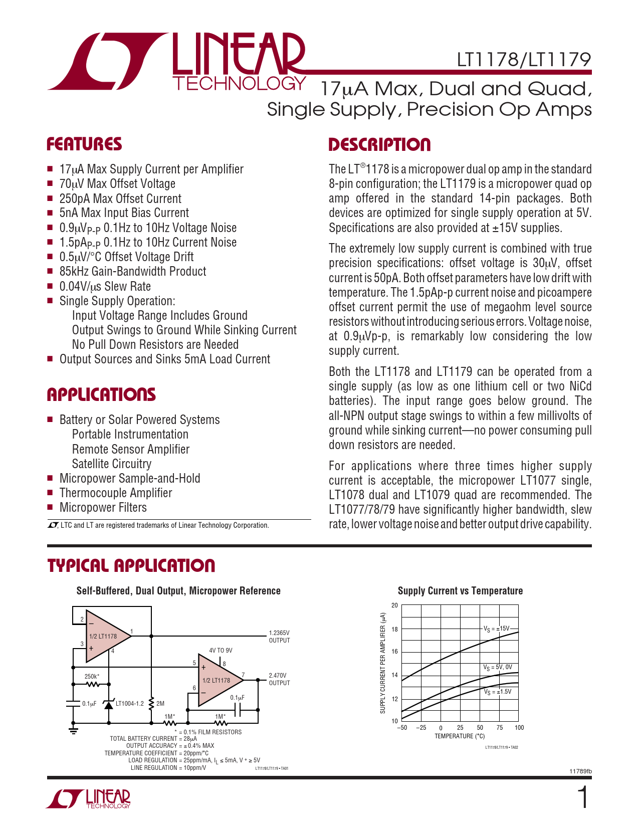LT1178/LT1179 17µA Max, Dual and Quad, Single Supply, Precision Op Amps