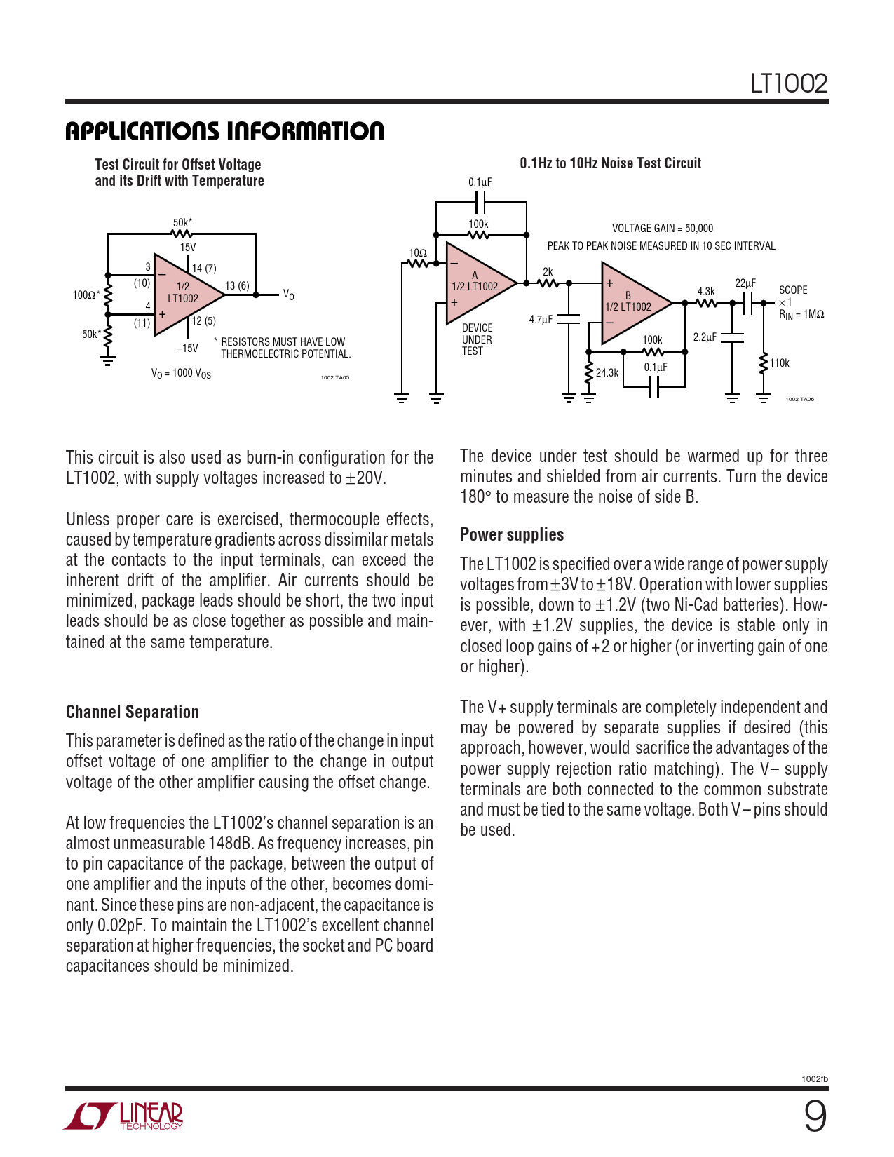 The V+ supply terminals are completely independent and may be powered by separate supplies if desired (this This parameter is defined as the ratio of the change in input approach, however, would sacrifice the advantages of the offset voltage of one amplifier to the change in output power supply rejection ratio matching). The V– supply voltage of the other amplifier causing the offset change. terminals are both connected to the common substrate and must be tied to the same voltage. Both V – pins should At low frequencies the LT1002’s channel separation is an be used. almost unmeasurable 148dB. As frequency increases, pin to pin capacitance of the package, between the output of one amplifier and the inputs of the other, becomes domi- nant. Since these pins are non-adjacent, the capacitance is only 0.02pF. To maintain the LT1002’s excellent channel separation at higher frequencies, the socket and PC board capacitances should be minimized. 1002fb 9