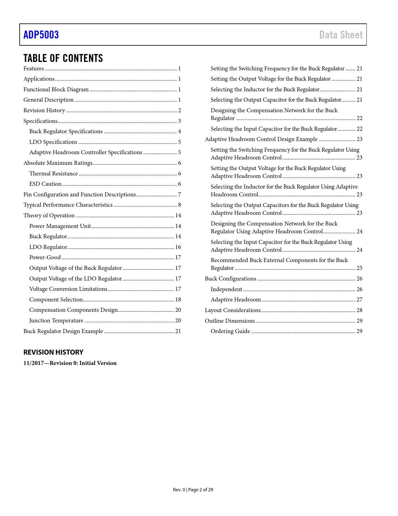 link to page 1 link to page 1 link to page 1 link to page 1 link to page 2 link to page 3 link to page 4 link to page 5 link to page 5 link to page 6 link to page 6 link to page 6 link to page 7 link to page 8 link to page 14 link to page 14 link to page 14 link to page 16 link to page 17 link to page 17 link to page 17 link to page 17 link to page 18 link to page 20 link to page 20 link to page 21 link to page 21 link to page 21 link to page 21 link to page 21 link to page 22 link to page 22 link to page 22 link to page 23 link to page 23 link to page 23 link to page 23 link to page 23 link to page 23 link to page 23 link to page 23 link to page 23 link to page 24 link to page 24 link to page 24 link to page 24 link to page 25 link to page 25 link to page 26 link to page 26 link to page 27 link to page 28 link to page 29 link to page 29 ADP5003Data SheetTABLE OF CONTENTS Features .. 1 Setting the Switching Frequency for the Buck Regulator ... 21 Applications ... 1 Setting the Output Voltage for the Buck Regulator ... 21 Functional Block Diagram .. 1 Selecting the Inductor for the Buck Regulator ... 21 General Description ... 1 Selecting the Output Capacitor for the Buck Regulator .. 21 Revision History ... 2 Designing the Compensation Network for the Buck Specifications ... 3 Regulator ... 22 Buck Regulator Specifications .. 4 Selecting the Input Capacitor for the Buck Regulator ... 22 LDO Specifications .. 5 Adaptive Headroom Control Design Example .. 23 Adaptive Headroom Controller Specifications .. 5 Setting the Switching Frequency for the Buck Regulator Using Adaptive Headroom Control .. 23 Absolute Maximum Ratings .. 6 Setting the Output Voltage for the Buck Regulator Using Thermal Resistance .. 6 Adaptive Headroom Control .. 23 ESD Caution .. 6 Selecting the Inductor for the Buck Regulator Using Adaptive Pin Configuration and Function Descriptions ... 7 Headroom Control ... 23 Typical Performance Characteristics ... 8 Selecting the Output Capacitors for the Buck Regulator Using Theory of Operation .. 14 Adaptive Headroom Control .. 23 Power Management Unit ... 14 Designing the Compensation Network for the Buck Regulator Using Adaptive Headroom Control ... 24 Buck Regulator .. 14 Selecting the Input Capacitor for the Buck Regulator Using LDO Regulator .. 16 Adaptive Headroom Control .. 24 Power-Good .. 17 Recommended Buck External Components for the Buck Output Voltage of the Buck Regulator ... 17 Regulator .. 25 Output Voltage of the LDO Regulator ... 17 Buck Configurations .. 26 Voltage Conversion Limitations ... 17 Independent .. 26 Component Selection... 18 Adaptive Headroom ... 27 Compensation Components Design .. 20 Layout Considerations ... 28 Junction Temperature .. 20 Outline Dimensions ... 29 Buck Regulator Design Example .. 21 Ordering Guide .. 29 REVISION HISTORY11/2017—Revision 0: Initial Version Rev. 0 | Page 2 of 29 Document Outline FEATURES APPLICATIONS FUNCTIONAL BLOCK DIAGRAM GENERAL DESCRIPTION TABLE OF CONTENTS REVISION HISTORY SPECIFICATIONS BUCK REGULATOR SPECIFICATIONS LDO SPECIFICATIONS ADAPTIVE HEADROOM CONTROLLER SPECIFICATIONS ABSOLUTE MAXIMUM RATINGS THERMAL RESISTANCE ESD CAUTION PIN CONFIGURATION AND FUNCTION DESCRIPTIONS TYPICAL PERFORMANCE CHARACTERISTICS THEORY OF OPERATION POWER MANAGEMENT UNIT Adaptive Headroom Control Precision Enable/Shutdown Undervoltage Lockout (UVLO) Thermal Shutdown (TSD) Active Pull Down Soft Start (SS) Power-Good BUCK REGULATOR Control Scheme Oscillator Frequency Control External Oscillator Synchronization Buck Startup Current-Limit and Short-Circuit Protection LDO REGULATOR LDO Startup Current Limit Differential Remote Sensing POWER-GOOD OUTPUT VOLTAGE OF THE BUCK REGULATOR OUTPUT VOLTAGE OF THE LDO REGULATOR VOLTAGE CONVERSION LIMITATIONS COMPONENT SELECTION Output Capacitors Input Capacitor Inductor COMPENSATION COMPONENTS DESIGN JUNCTION TEMPERATURE BUCK REGULATOR DESIGN EXAMPLE SETTING THE SWITCHING FREQUENCY FOR THE BUCK REGULATOR SETTING THE OUTPUT VOLTAGE FOR THE BUCK REGULATOR SELECTING THE INDUCTOR FOR THE BUCK REGULATOR SELECTING THE OUTPUT CAPACITOR FOR THE BUCK REGULATOR DESIGNING THE COMPENSATION NETWORK FOR THE BUCK REGULATOR SELECTING THE INPUT CAPACITOR FOR THE BUCK REGULATOR ADAPTIVE HEADROOM CONTROL DESIGN EXAMPLE SETTING THE SWITCHING FREQUENCY FOR THE BUCK REGULATOR USING ADAPTIVE HEADROOM CONTROL SETTING THE OUTPUT VOLTAGE FOR THE BUCK REGULATOR USING ADAPTIVE HEADROOM CONTROL SELECTING THE INDUCTOR FOR THE BUCK REGULATOR USING ADAPTIVE HEADROOM CONTROL SELECTING THE OUTPUT CAPACITORS FOR THE BUCK REGULATOR USING ADAPTIVE HEADROOM CONTROL SELECTING THE INPUT CAPACITOR FOR THE BUCK REGULATOR USING ADAPTIVE HEADROOM CONTROL RECOMMENDED BUCK EXTERNAL COMPONENTS FOR THE BUCK REGULATOR BUCK CONFIGURATIONS INDEPENDENT ADAPTIVE HEADROOM LAYOUT CONSIDERATIONS OUTLINE DIMENSIONS ORDERING GUIDE