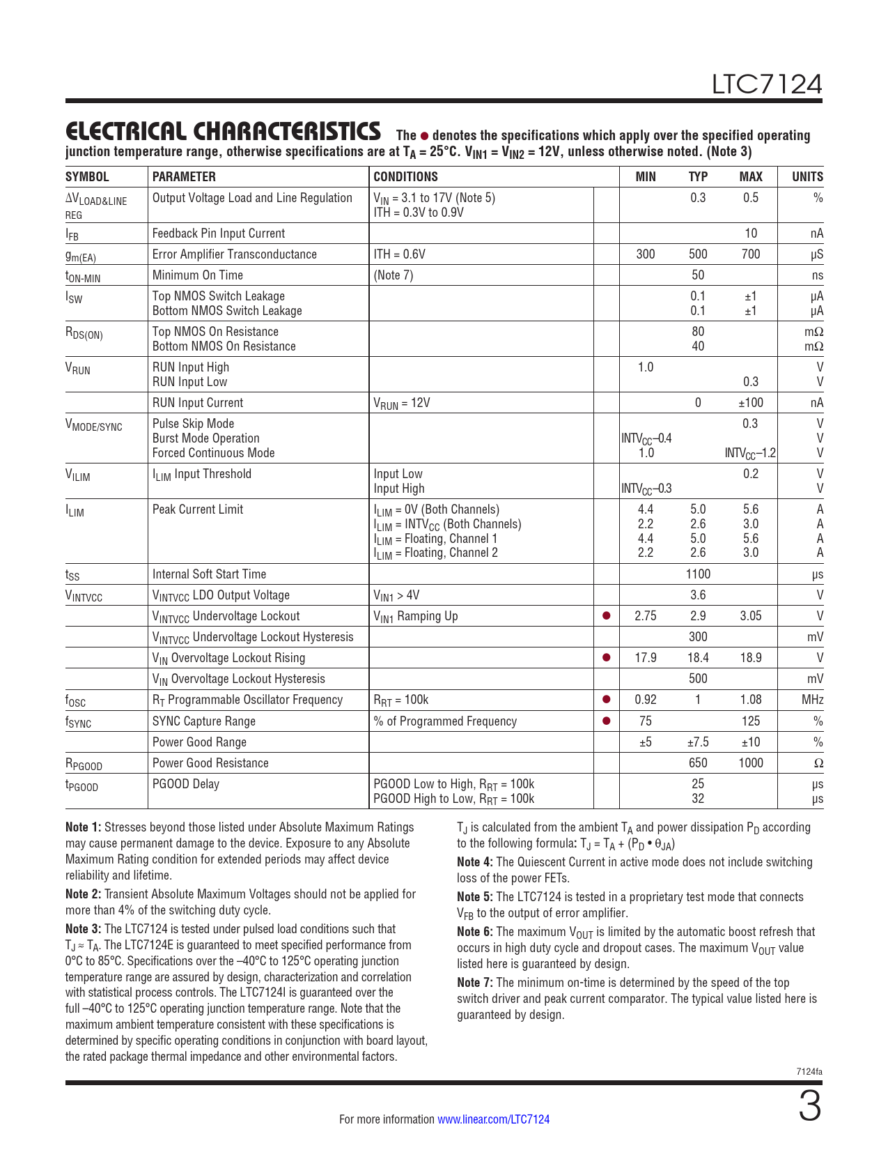 LTC7124 ELECTRICALCHARACTERISTICS The l denotes the specifications which apply over the specified operatingjunction temperature range, otherwise specifications are at TA = 25°C. VIN1 = VIN2 = 12V, unless otherwise noted. (Note 3) SYMBOLPARAMETERCONDITIONSMINTYPMAXUNITS ΔVLOAD&LINE Output Voltage Load and Line Regulation VIN = 3.1 to 17V (Note 5) 0.3 0.5 % REG ITH = 0.3V to 0.9V IFB Feedback Pin Input Current 10 nA gm(EA) Error Amplifier Transconductance ITH = 0.6V 300 500 700 µS tON-MIN Minimum On Time (Note 7) 50 ns ISW Top NMOS Switch Leakage 0.1 ±1 µA Bottom NMOS Switch Leakage 0.1 ±1 µA RDS(ON) Top NMOS On Resistance 80 mΩ Bottom NMOS On Resistance 40 mΩ VRUN RUN Input High 1.0 V RUN Input Low 0.3 V RUN Input Current VRUN = 12V 0 ±100 nA VMODE/SYNC Pulse Skip Mode 0.3 V Burst Mode Operation INTVCC–0.4 V Forced Continuous Mode 1.0 INTVCC–1.2 V VILIM ILIM Input Threshold Input Low 0.2 V Input High INTVCC–0.3 V ILIM Peak Current Limit ILIM = 0V (Both Channels) 4.4 5.0 5.6 A ILIM = INTVCC (Both Channels) 2.2 2.6 3.0 A ILIM = Floating, Channel 1 4.4 5.0 5.6 A ILIM = Floating, Channel 2 2.2 2.6 3.0 A tSS Internal Soft Start Time 1100 µs VINTVCC VINTVCC LDO Output Voltage VIN1 > 4V 3.6 V VINTVCC Undervoltage Lockout VIN1 Ramping Up l 2.75 2.9 3.05 V VINTVCC Undervoltage Lockout Hysteresis 300 mV VIN Overvoltage Lockout Rising l 17.9 18.4 18.9 V VIN Overvoltage Lockout Hysteresis 500 mV fOSC RT Programmable Oscillator Frequency RRT = 100k l 0.92 1 1.08 MHz fSYNC SYNC Capture Range % of Programmed Frequency l 75 125 % Power Good Range ±5 ±7.5 ±10 % RPGOOD Power Good Resistance 650 1000 Ω tPGOOD PGOOD Delay PGOOD Low to High, RRT = 100k 25 µs PGOOD High to Low, RRT = 100k 32 µs Note 1: Stresses beyond those listed under Absolute Maximum Ratings TJ is calculated from the ambient TA and power dissipation PD according may cause permanent damage to the device. Exposure to any Absolute to the following formula : TJ = TA + (PD • θJA) Maximum Rating condition for extended periods may affect device Note 4: The Quiescent Current in active mode does not include switching reliability and lifetime. loss of the power FETs. Note 2: Transient Absolute Maximum Voltages should not be applied for Note 5: The LTC7124 is tested in a proprietary test mode that connects more than 4% of the switching duty cycle. VFB to the output of error amplifier. Note 3: The LTC7124 is tested under pulsed load conditions such that Note 6: The maximum VOUT is limited by the automatic boost refresh that TJ ≈ TA. The LTC7124E is guaranteed to meet specified performance from occurs in high duty cycle and dropout cases. The maximum VOUT value 0°C to 85°C. Specifications over the –40°C to 125°C operating junction listed here is guaranteed by design. temperature range are assured by design, characterization and correlation Note 7: The minimum on-time is determined by the speed of the top with statistical process controls. The LTC7124I is guaranteed over the switch driver and peak current comparator. The typical value listed here is full –40°C to 125°C operating junction temperature range. Note that the guaranteed by design. maximum ambient temperature consistent with these specifications is determined by specific operating conditions in conjunction with board layout, the rated package thermal impedance and other environmental factors. 7124fa For more information www.linear.com/LTC7124 3