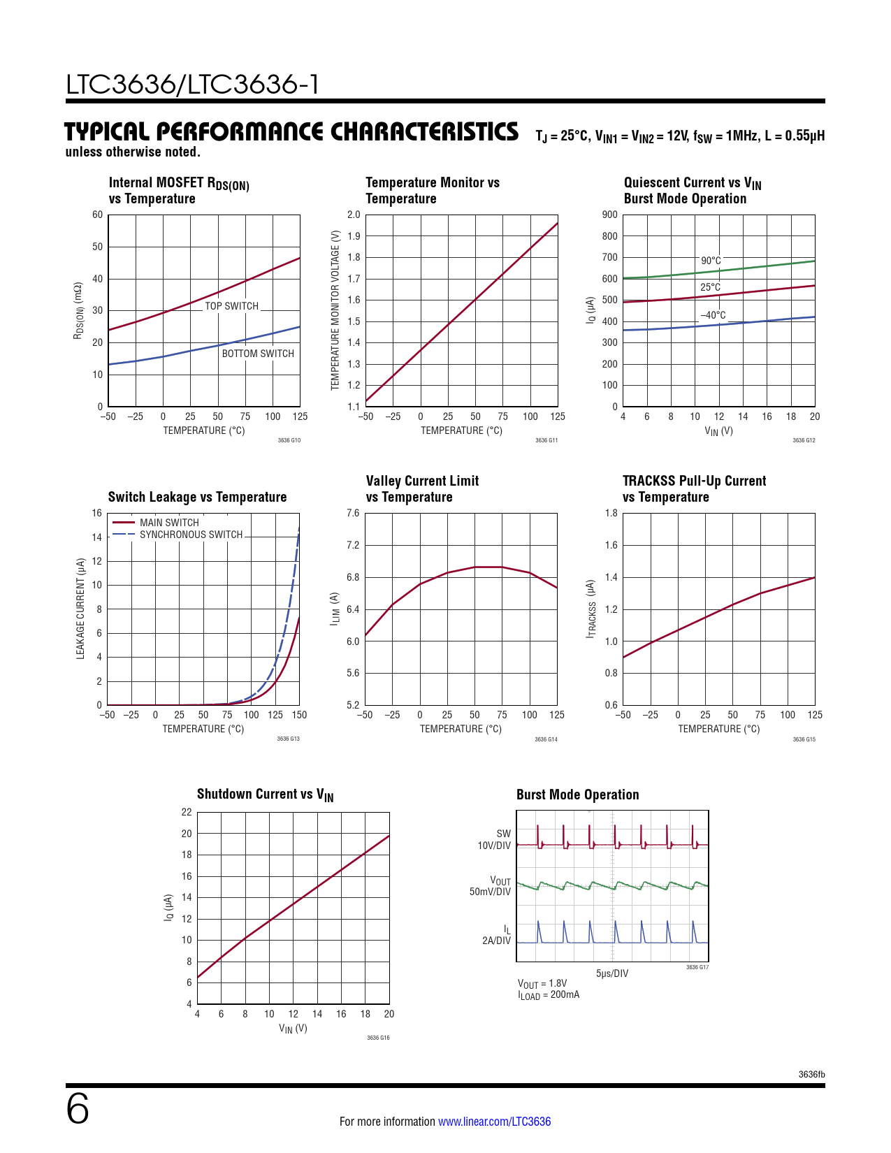 TYPICAL PERFORMANCE CHARACTERISTICS TJ = 25°C, VIN1 = VIN2 = 12V, fSW = 1MHz, L = 0.55µH unless otherwise noted. Internal MOSFET RDS(ON) Temperature Monitor vs Quiescent Current vs VIN vs Temperature Temperature Burst Mode Operation