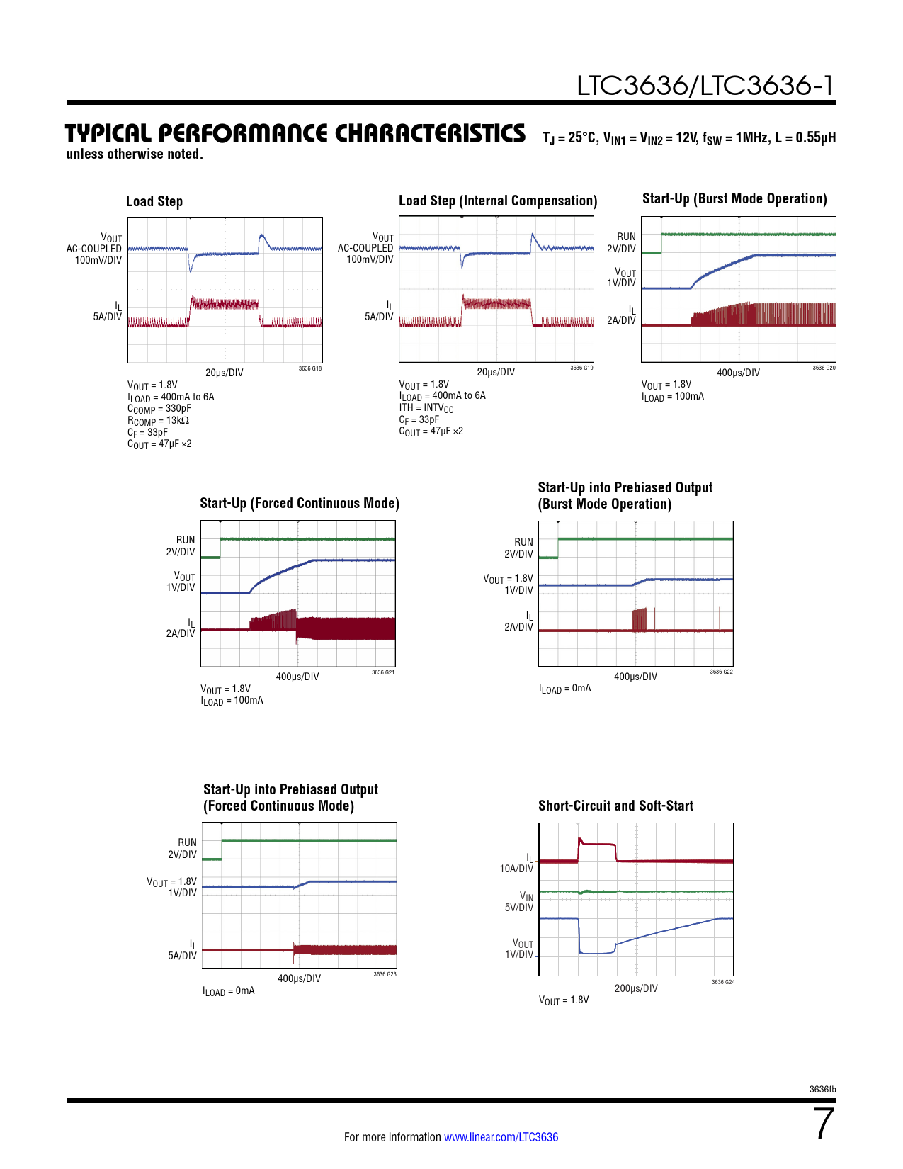 VOUT VOUT RUN AC-COUPLED AC-COUPLED 2V/DIV 100mV/DIV 100mV/DIV VOUT 1V/DIV IL IL I 5A/DIV 5A/DIV L 2A/DIV 20µs/DIV 3636 G18 20µs/DIV 3636 G19 400µs/DIV 3636 G20 VOUT = 1.8V VOUT = 1.8V VOUT = 1.8V ILOAD = 400mA to 6A ILOAD = 400mA to 6A ILOAD = 100mA CCOMP = 330pF ITH = INTVCC RCOMP = 13kΩ CF = 33pF CF = 33pF COUT = 47µF ×2 COUT = 47µF ×2