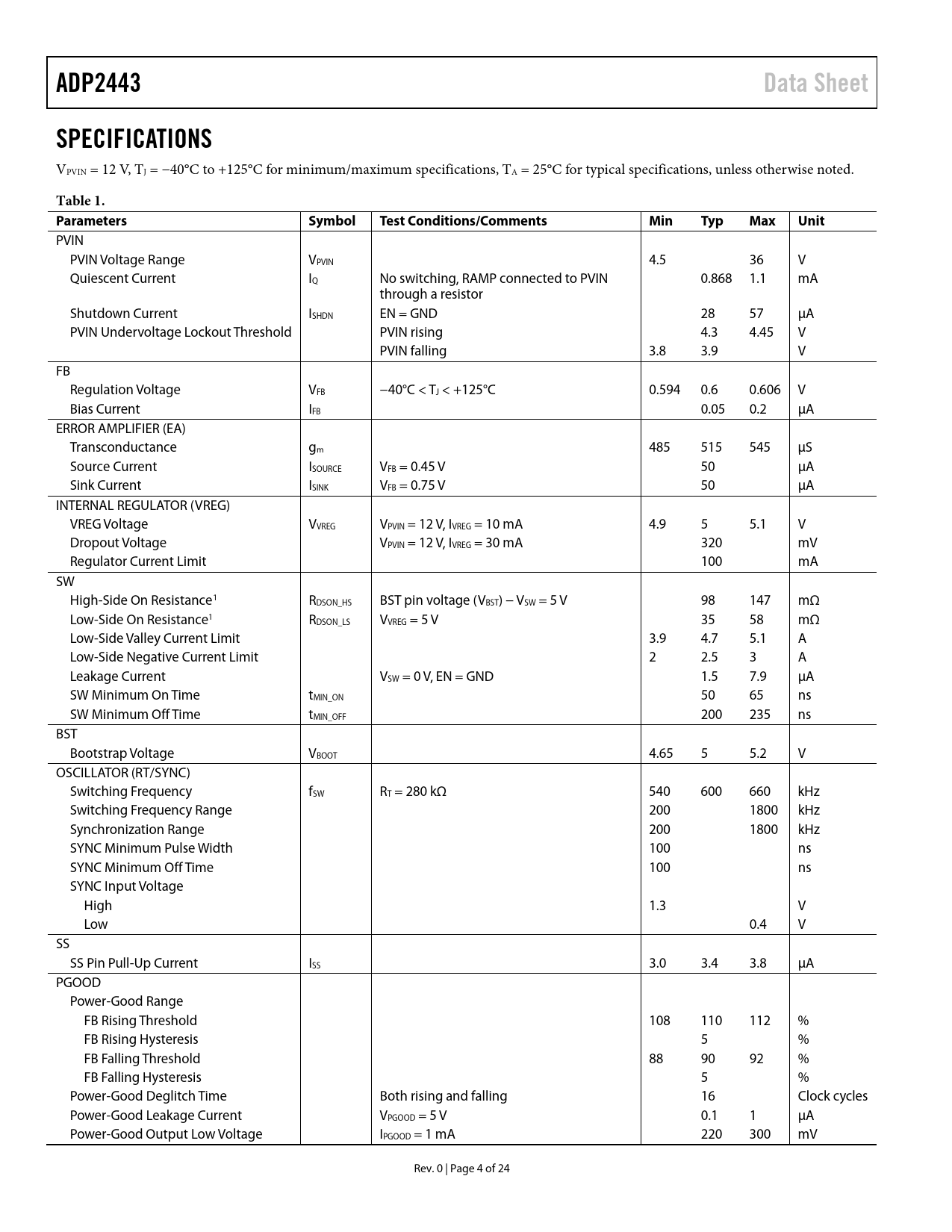 页数 / 页24 / 4 — ADP2443. Data Sheet. SPECIFICATIONS. Table 1. Parameters. Symbol. Test …