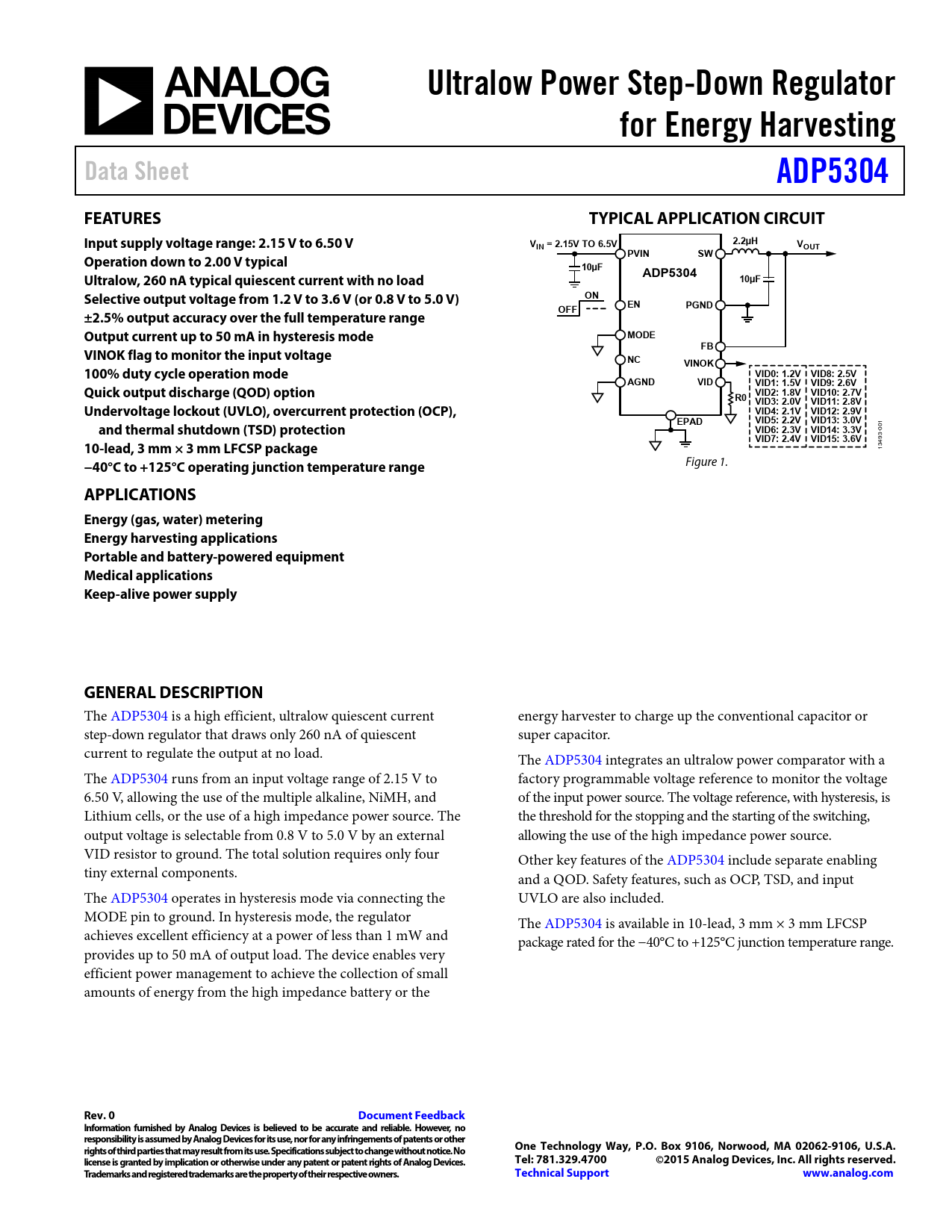 Ultralow Power Step-Down Regulator. for Energy Harvesting. Data Sheet. ADP5304. FEATURES. TYPICAL APPLICATION CIRCUIT