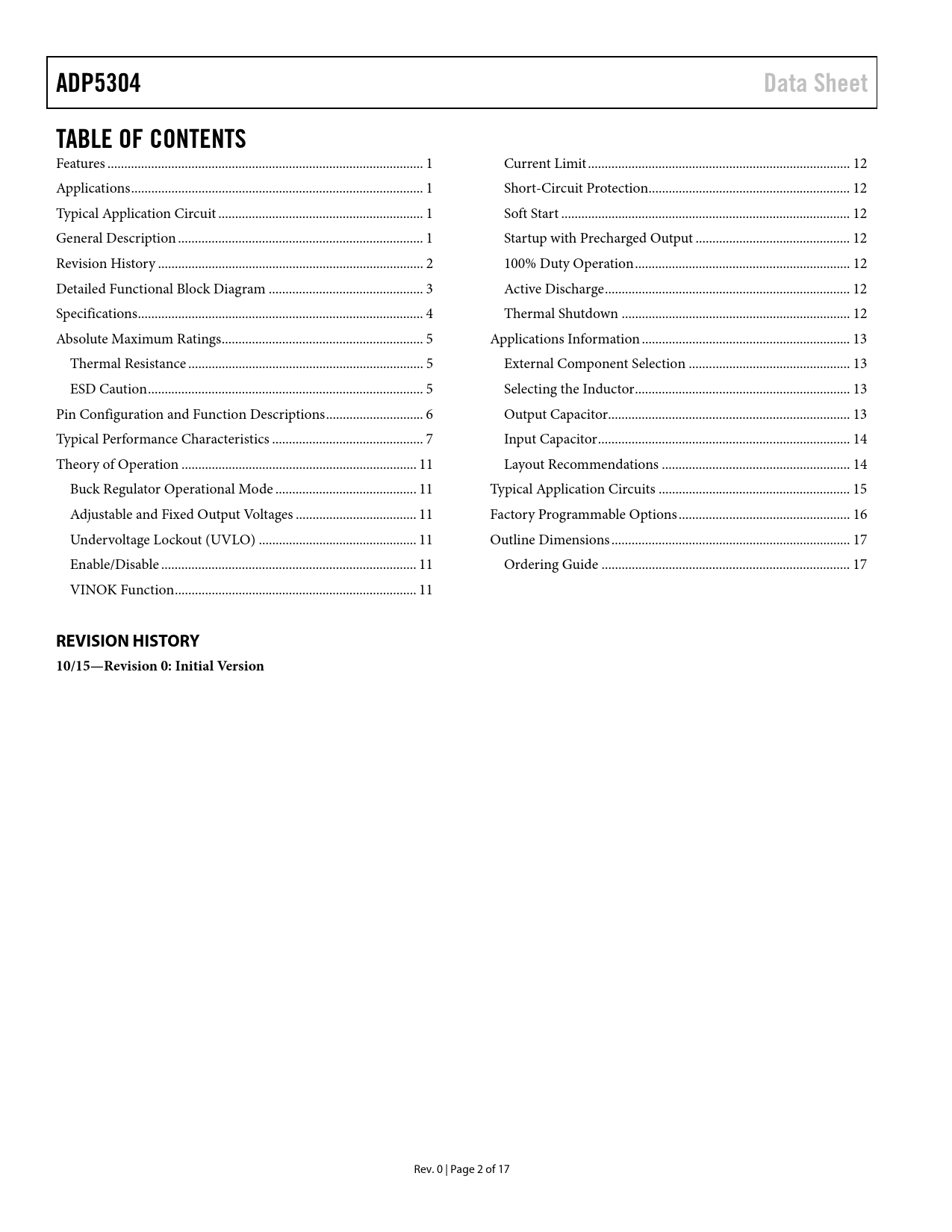 页数 / 页17 / 2 — ADP5304. Data Sheet. TABLE OF CONTENTS. REVISION HISTORY. 10/15—Revision …