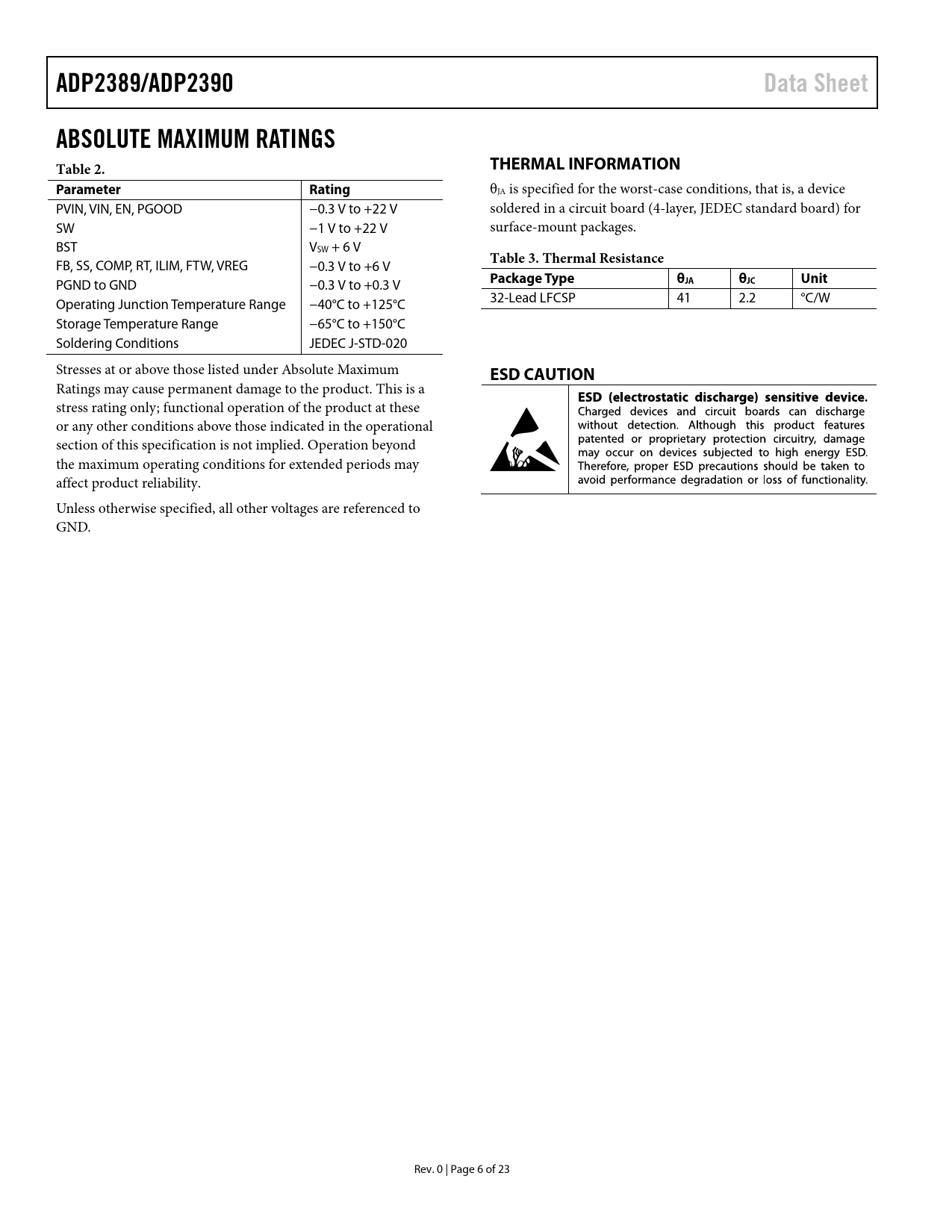 ADP2389/ADP2390. Data Sheet. ABSOLUTE MAXIMUM RATINGS Table 2. THERMAL INFORMATION. Parameter Rating. Table 3. Thermal Resistance