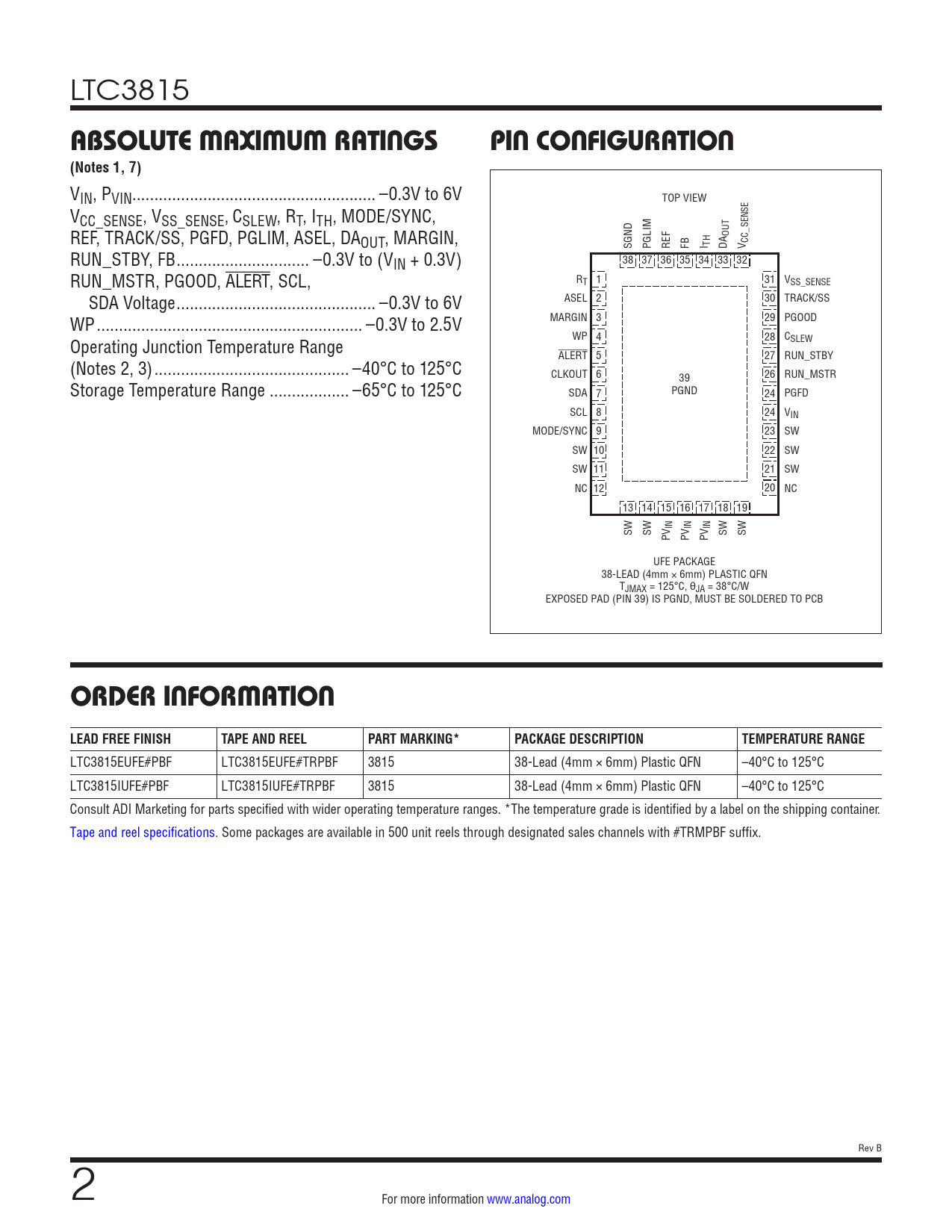 LTC3815EUFE#PBF LTC3815EUFE#TRPBF 3815 38-Lead (4mm × 6mm) Plastic QFN –40°C to 125°C LTC3815IUFE#PBF LTC3815IUFE#TRPBF 3815 38-Lead (4mm × 6mm) Plastic QFN –40°C to 125°C Consult ADI Marketing for parts specified with wider operating temperature ranges. *The temperature grade is identified by a label on the shipping container. Tape and reel specifications. Some packages are available in 500 unit reels through designated sales channels with #TRMPBF suffix. Rev B 2 For more information www.analog.com Document Outline Features Applications Typical Application Description Absolute Maximum Ratings Order Information Pin Configuration Electrical Characteristics Typical Performance Characteristics Pin Functions Block Diagram Operation Applications Information PMBus Command Details Typical Applications Package Description Revision History Typical Application Related Parts