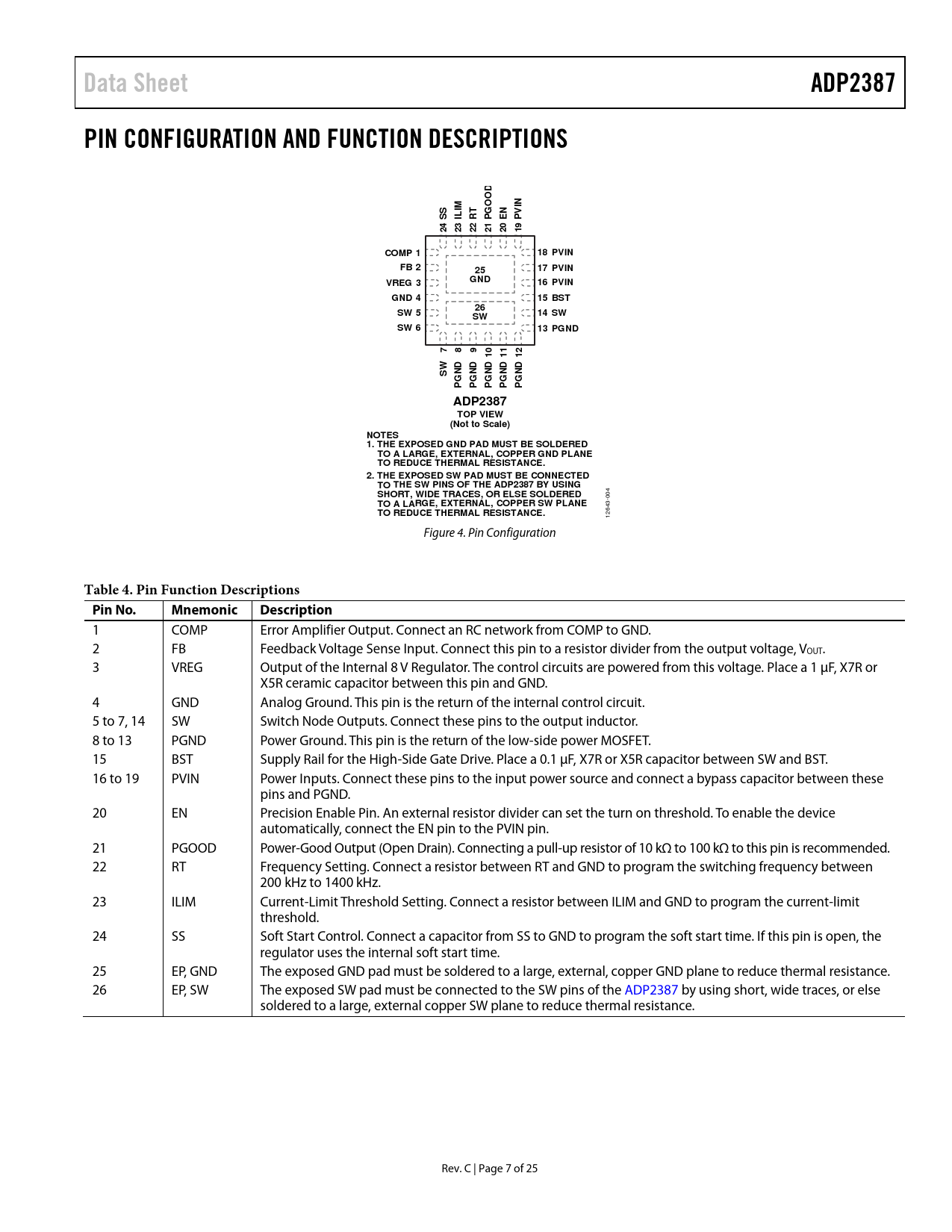 Data SheetADP2387PIN CONFIGURATION AND FUNCTION DESCRIPTIONSNGOODSSILIMRTPENPVI242322212019COMP 118 PVINFB 21725PVINVREG 3GND16 PVINGND 415 BST26SW 514SWSWSW 613 PGND789101112SWNDNDNDNDNDGGGGGPPPPPADP2387TOP VIEW(Not to Scale)NOTES 1. THE EXPOSED GND PAD MUST BE SOLDERED TO A LARGE, EXTERNAL, COPPER GND PLANE TO REDUCE THERMAL RESISTANCE. 2. THE EXPOSED SW PAD MUST BE CONNECTED TO THE SW PINS OF THE ADP2387 BY USING SHORT, WIDE TRACES, OR ELSE SOLDERED 004 TO A LARGE, EXTERNAL, COPPER SW PLANE TO REDUCE THERMAL RESISTANCE. 12643- Figure 4. Pin Configuration Table 4. Pin Function DescriptionsPin No.MnemonicDescription 1 COMP Error Amplifier Output. Connect an RC network from COMP to GND. 2 FB Feedback Voltage Sense Input. Connect this pin to a resistor divider from the output voltage, VOUT. 3 VREG Output of the Internal 8 V Regulator. The control circuits are powered from this voltage. Place a 1 µF, X7R or X5R ceramic capacitor between this pin and GND. 4 GND Analog Ground. This pin is the return of the internal control circuit. 5 to 7, 14 SW Switch Node Outputs. Connect these pins to the output inductor. 8 to 13 PGND Power Ground. This pin is the return of the low-side power MOSFET. 15 BST Supply Rail for the High-Side Gate Drive. Place a 0.1 µF, X7R or X5R capacitor between SW and BST. 16 to 19 PVIN Power Inputs. Connect these pins to the input power source and connect a bypass capacitor between these pins and PGND. 20 EN Precision Enable Pin. An external resistor divider can set the turn on threshold. To enable the device automatically, connect the EN pin to the PVIN pin. 21 PGOOD Power-Good Output (Open Drain). Connecting a pull-up resistor of 10 kΩ to 100 kΩ to this pin is recommended. 22 RT Frequency Setting. Connect a resistor between RT and GND to program the switching frequency between 200 kHz to 1400 kHz. 23 ILIM Current-Limit Threshold Setting. Connect a resistor between ILIM and GND to program the current-limit threshold. 24 SS Soft Start Control. Connect a capacitor from SS to GND to program the soft start time. If this pin is open, the regulator uses the internal soft start time. 25 EP, GND The exposed GND pad must be soldered to a large, external, copper GND plane to reduce thermal resistance. 26 EP, SW The exposed SW pad must be connected to the SW pins of the ADP2387 by using short, wide traces, or else soldered to a large, external copper SW plane to reduce thermal resistance. Rev. C | Page 7 of 25 Document Outline FEATURES APPLICATIONS TYPICAL APPLICATIONS CIRCUIT GENERAL DESCRIPTION TABLE OF CONTENTS REVISION HISTORY FUNCTIONAL BLOCK DIAGRAM SPECIFICATIONS ABSOLUTE MAXIMUM RATINGS THERMAL RESISTANCE ESD CAUTION PIN CONFIGURATION AND FUNCTION DESCRIPTIONS TYPICAL PERFORMANCE CHARACTERISTICS THEORY OF OPERATION CONTROL SCHEME PRECISION ENABLE/SHUTDOWN INTERNAL REGULATOR (VREG) BOOTSTRAP CIRCUITRY OSCILLATOR SOFT START POWER GOOD PEAK CURRENT-LIMIT AND SHORT-CIRCUIT PROTECTION OVERVOLTAGE PROTECTION (OVP) UNDERVOLTAGE LOCKOUT (UVLO) THERMAL SHUTDOWN APPLICATIONS INFORMATION INPUT CAPACITOR SELECTION OUTPUT VOLTAGE SETTING VOLTAGE CONVERSION LIMITATIONS INDUCTOR SELECTION OUTPUT CAPACITOR SELECTION PROGRAMMING INPUT VOLTAGE UVLO COMPENSATION DESIGN ADIsimPower DESIGN TOOL DESIGN EXAMPLE OUTPUT VOLTAGE SETTING FREQUENCY SETTING CURRENT-LIMIT THRESHOLD SETTING INDUCTOR SELECTION OUTPUT CAPACITOR SELECTION COMPENSATION COMPONENTS SOFT START TIME PROGRAM INPUT CAPACITOR SELECTION RECOMMENDED EXTERNAL COMPONENTS CIRCUIT BOARD LAYOUT RECOMMENDATIONS TYPICAL APPLICATIONS CIRCUITS OUTLINE DIMENSIONS ORDERING GUIDE