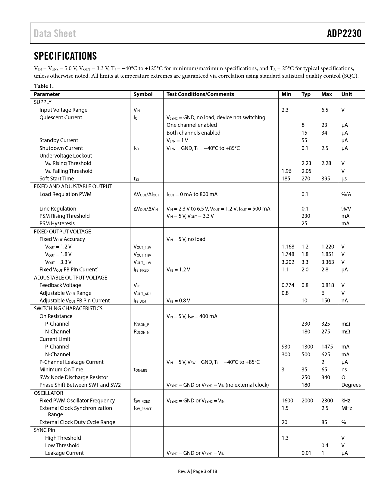 Data Sheet. ADP2230. SPECIFICATIONS. Table 1. Parameter. Symbol. Test Conditions/Comments. Min. Typ. Max. Unit