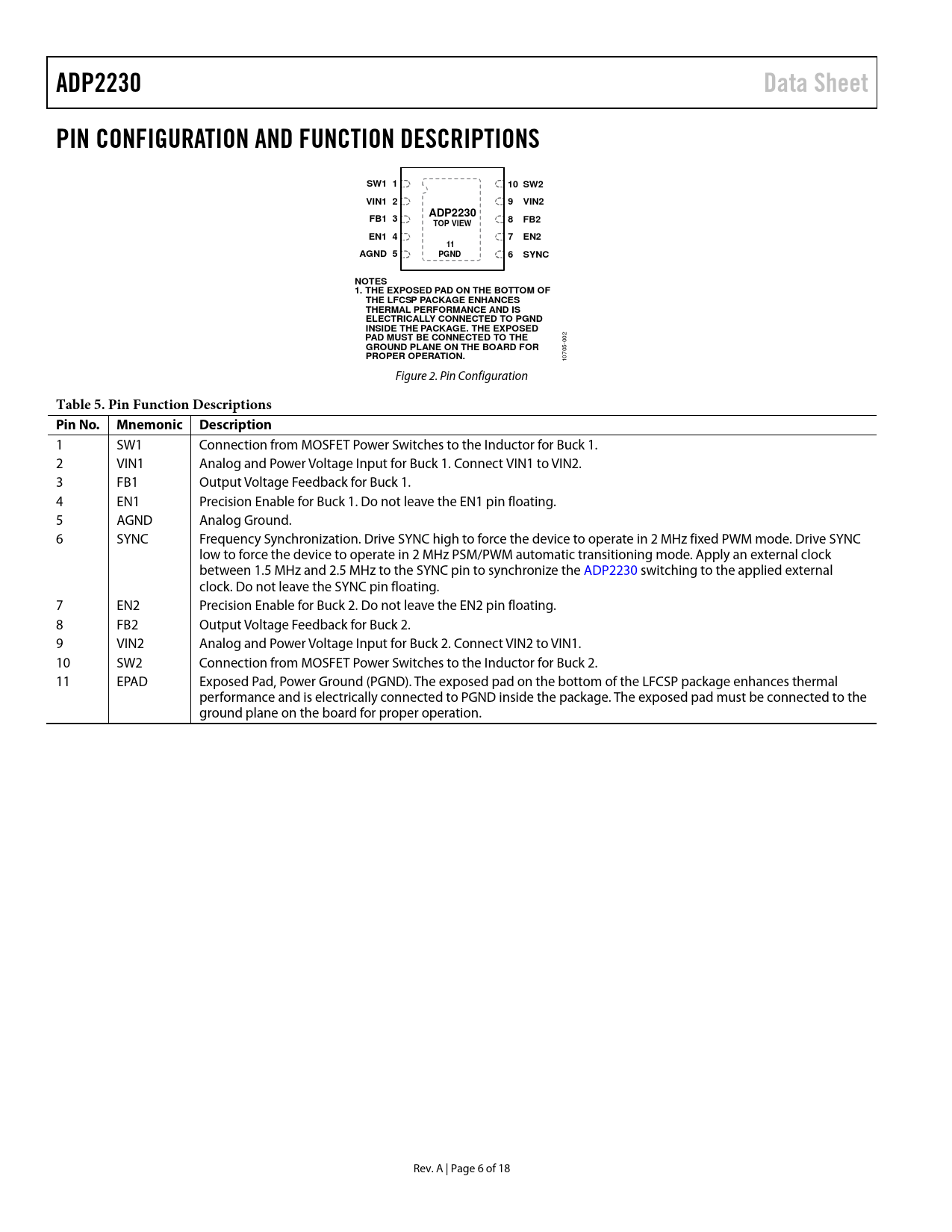 ADP2230 Data Sheet PIN CONFIGURATION AND FUNCTION DESCRIPTIONS SW1 1 10 SW2 VIN1 2 9 VIN2 ADP2230 FB1 3 8 FB2 TOP VIEW EN1 4 7 EN2 11 AGND 5 PGND 6 SYNC NOTES 1. THE EXPOSED PAD ON THE BOTTOM OF THE LFCSP PACKAGE ENHANCES THERMAL PERFORMANCE AND IS ELECTRICALLY CONNECTED TO PGND INSIDE THE PACKAGE. THE EXPOSED PAD MUST BE CONNECTED TO THE