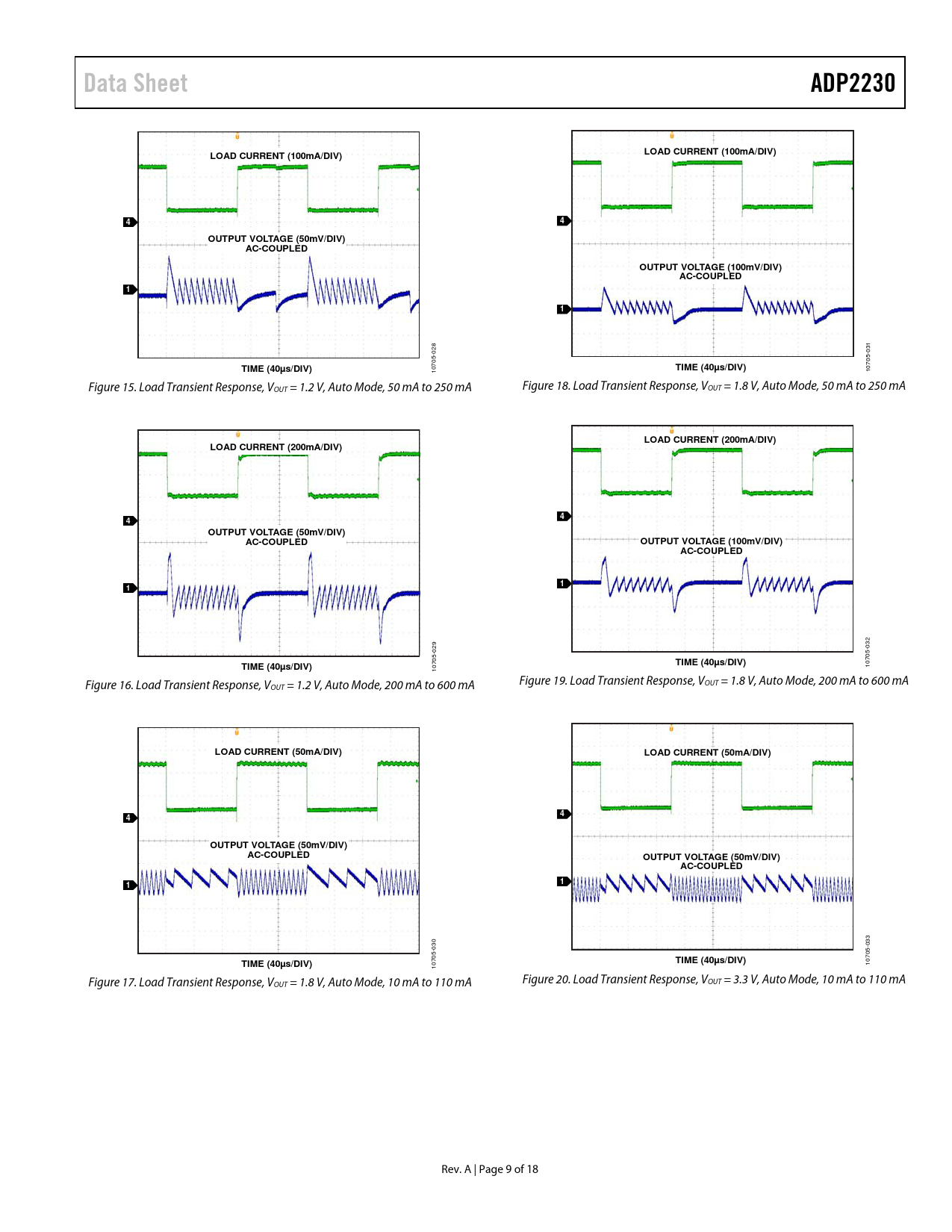 页数 / 页18 / 9 — Data Sheet. ADP2230. LOAD CURRENT (100mA/DIV). OUTPUT VOLTAGE (50mV/DIV). …