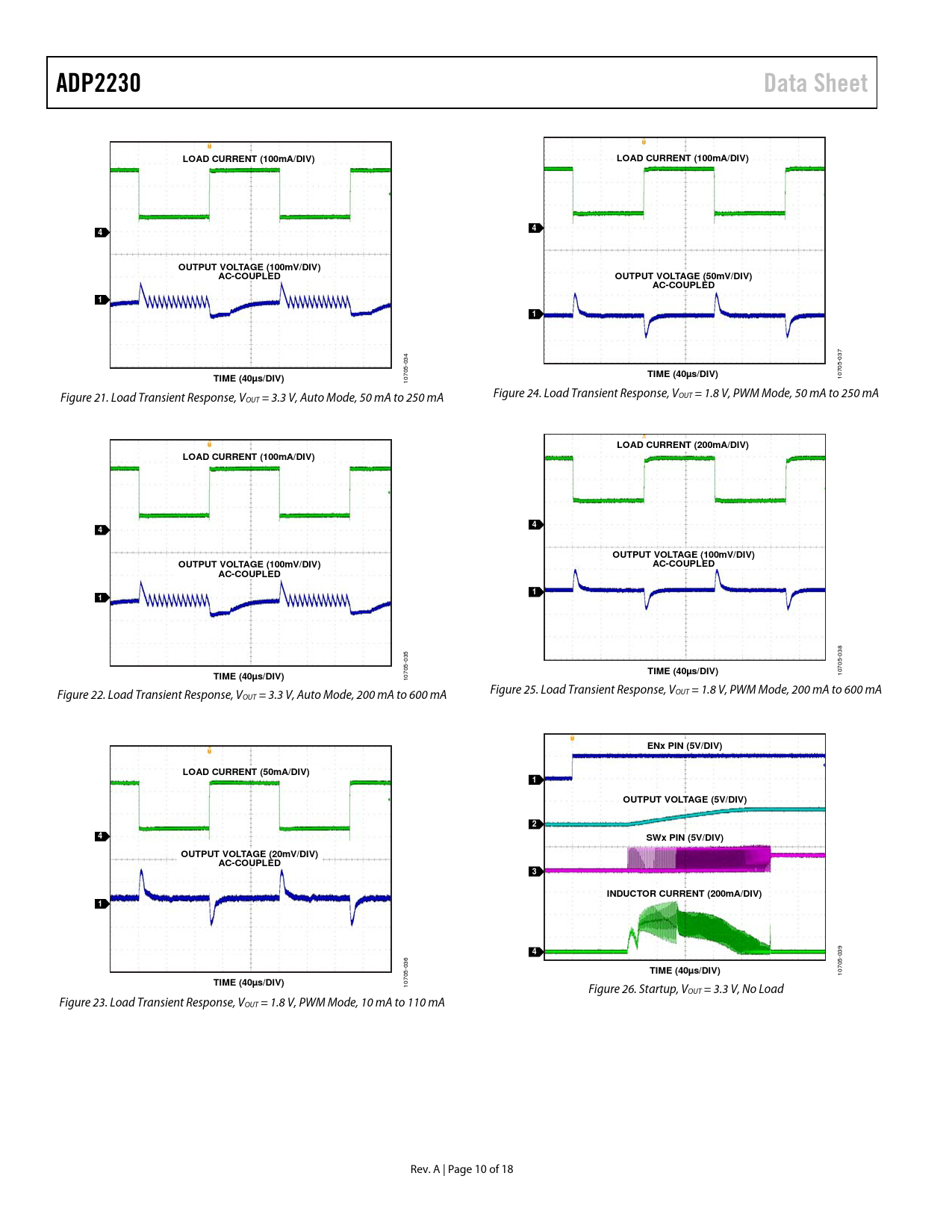 ADP2230Data SheetLOAD CURRENT (100mA/DIV)LOAD CURRENT (100mA/DIV)44OUTPUT VOLTAGE (100mV/DIV)AC-COUPLEDOUTPUT VOLTAGE (50mV/DIV)AC-COUPLED11 037 034 5- 5- TIME (40µs/DIV)TIME (40µs/DIV) 1070 1070 Figure 21. Load Transient Response, V Figure 24. Load Transient Response, VOUT = 1.8 V, PWM Mode, 50 mA to 250 mA OUT = 3.3 V, Auto Mode, 50 mA to 250 mA LOAD CURRENT (200mA/DIV)LOAD CURRENT (100mA/DIV)44OUTPUT VOLTAGE (100mV/DIV)OUTPUT VOLTAGE (100mV/DIV)AC-COUPLEDAC-COUPLED11 038 035 5- 5- TIME (40µs/DIV)TIME (40µs/DIV) 1070 1070 Figure 22. Load Transient Response, V Figure 25. Load Transient Response, VOUT = 1.8 V, PWM Mode, 200 mA to 600 mA OUT = 3.3 V, Auto Mode, 200 mA to 600 mA ENx PIN (5V/DIV)LOAD CURRENT (50mA/DIV)1OUTPUT VOLTAGE (5V/DIV)24SWx PIN (5V/DIV)OUTPUT VOLTAGE (20mV/DIV)AC-COUPLED3INDUCTOR CURRENT (200mA/DIV)14 039 05- 036 5- TIME (40µs/DIV) 107 TIME (40µs/DIV) 1070 Figure 26. Startup, VOUT = 3.3 V, No Load Figure 23. Load Transient Response, VOUT = 1.8 V, PWM Mode, 10 mA to 110 mA Rev. A | Page 10 of 18 Document Outline FEATURES APPLICATIONS GENERAL DESCRIPTION TYPICAL APPLICATION CIRCUIT TABLE OF CONTENTS REVISION HISTORY SPECIFICATIONS RECOMMENDED COMPONENT SPECIFICATIONS ABSOLUTE MAXIMUM RATINGS THERMAL DATA THERMAL RESISTANCE ESD CAUTION PIN CONFIGURATION AND FUNCTION DESCRIPTIONS TYPICAL PERFORMANCE CHARACTERISTICS THEORY OF OPERATION OVERVIEW OPERATING CONDITIONS Input Voltage Output Voltage SYNC PIN CONTROL SCHEMES PWM Mode PSM/PWM Automatic Transitioning Mode External Clock Synchronization FEATURES DESCRIPTIONS Precision Enable Quick Output Discharge Output Short-Circuit Protection Undervoltage Lockout Thermal Shutdown Soft Start Current Limit 100% Duty Cycle APPLICATIONS INFORMATION SETTING THE OUTPUT VOLTAGE SELECTING THE INDUCTOR SELECTING THE INPUT AND OUTPUT CAPACITORS Input Capacitor Output Capacitor PCB LAYOUT CONSIDERATIONS OUTLINE DIMENSIONS ORDERING GUIDE