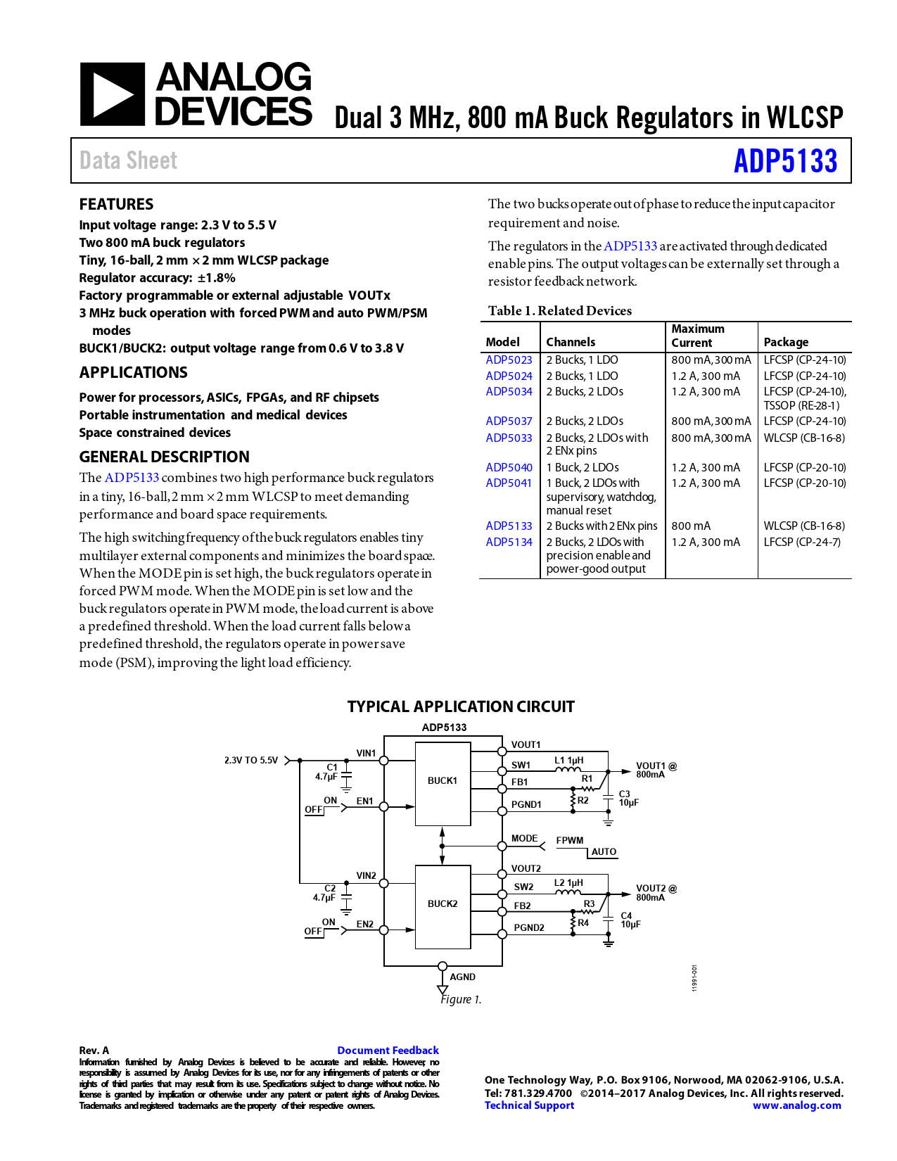 Dual 3 MHz, 800 mA Buck Regulators in WLCSP Data Sheet ADP5133 FEATURES
