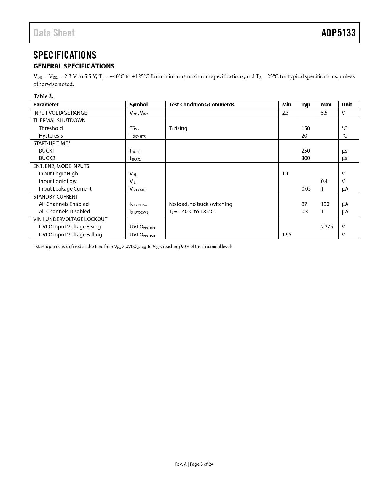 页数 / 页24 / 3 — Data Sheet. ADP5133. SPECIFICATIONS GENERAL SPECIFICATIONS. Table 2. …