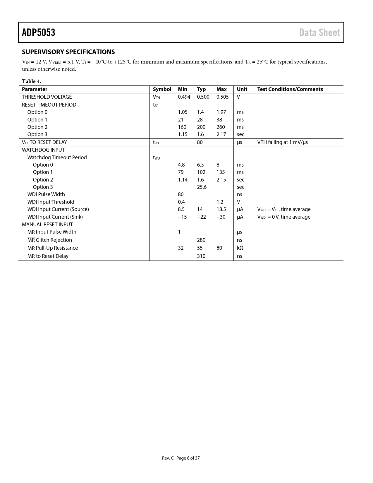 | 页数 / 页 | 37 / 8 — ADP5053. Data Sheet. SUPERVISORY SPECIFICATIONS. Table 4. Parameter. … |