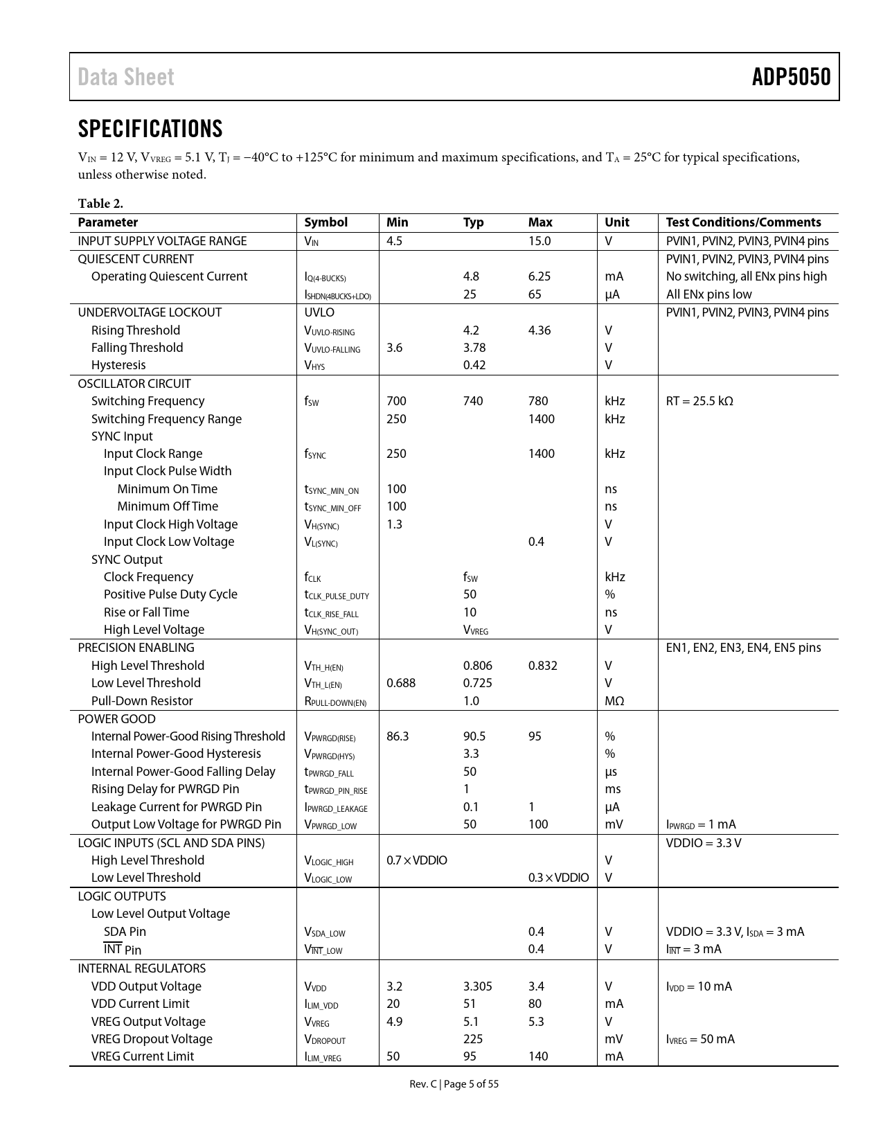 | 页数 / 页 | 55 / 5 — Data Sheet. ADP5050. SPECIFICATIONS. Table 2. Parameter. Symbol. Min. … |