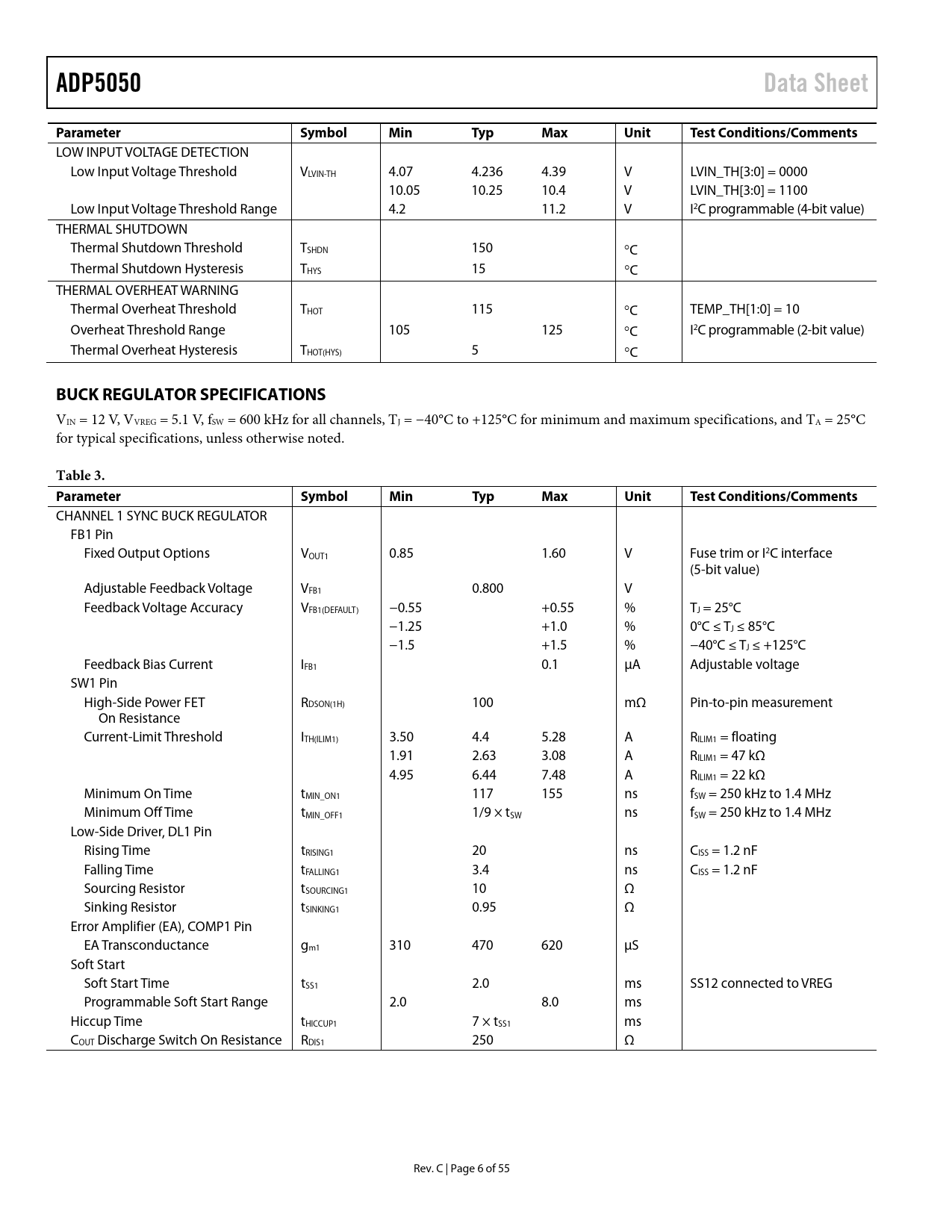 | 页数 / 页 | 55 / 6 — ADP5050. Data Sheet. Parameter. Symbol. Min. Typ. Max. Unit. Test … |