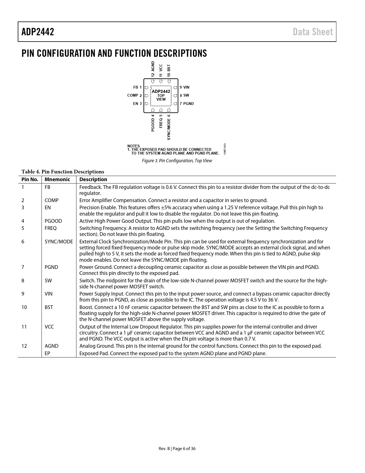 页数 / 页36 / 6 — ADP2442. Data Sheet. PIN CONFIGURATION AND FUNCTION DESCRIPTIONS. CCV. FB …