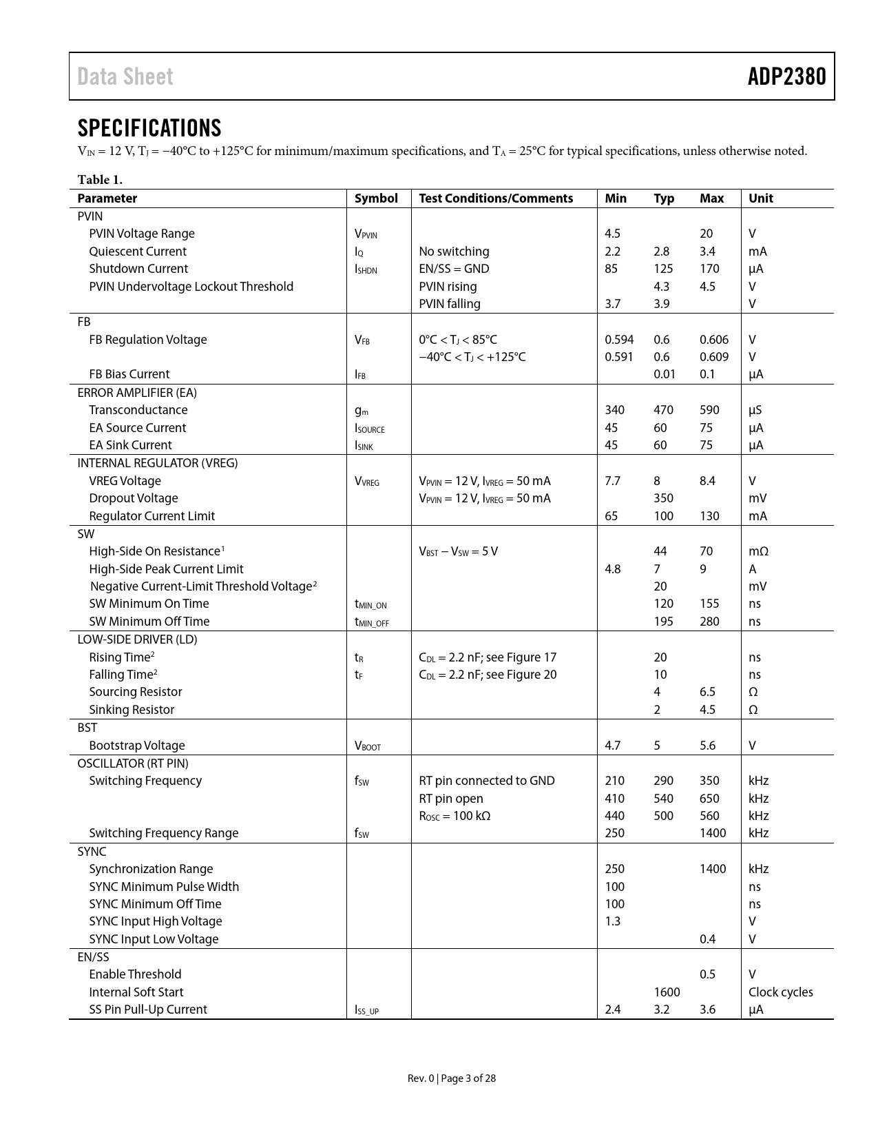 Data Sheet. ADP2380. SPECIFICATIONS. Table 1. Parameter. Symbol. Test Conditions/Comments. Min. Typ. Max. Unit