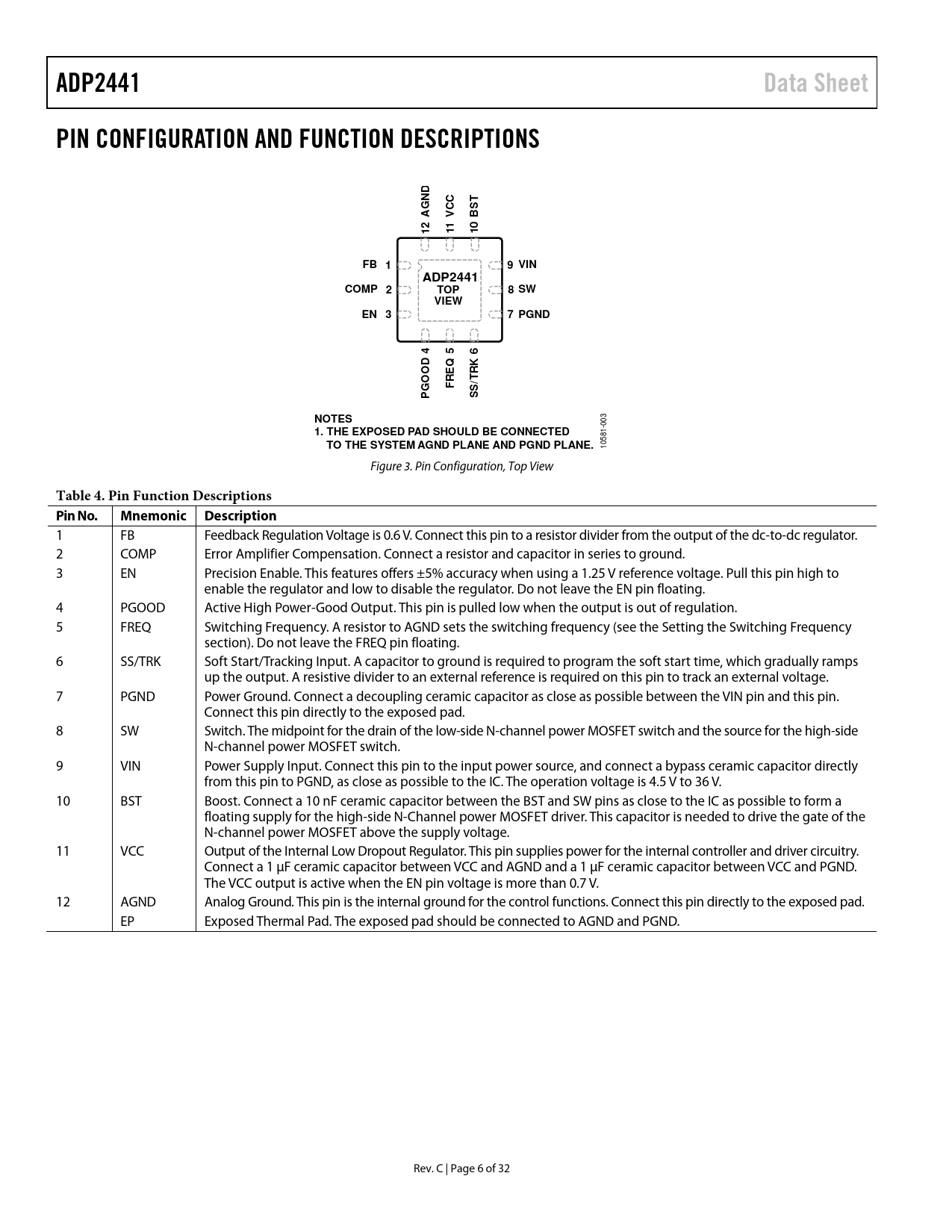 link to page 18 ADP2441Data SheetPIN CONFIGURATION AND FUNCTION DESCRIPTIONSNDTCCAGVBS112110FB 19 VINADP2441COMP 2TOP8 SWVIEWEN 37 PGND456QK RRETGOODFPSS/NOTES 003 1. THE EXPOSED PAD SHOULD BE CONNECTEDTO THE SYSTEM AGND PLANE AND PGND PLANE. 10581- Figure 3. Pin Configuration, Top View Table 4. Pin Function Descriptions Pin No.Mnemonic Description 1 FB Feedback Regulation Voltage is 0.6 V. Connect this pin to a resistor divider from the output of the dc-to-dc regulator. 2 COMP Error Amplifier Compensation. Connect a resistor and capacitor in series to ground. 3 EN Precision Enable. This features offers ±5% accuracy when using a 1.25 V reference voltage. Pull this pin high to enable the regulator and low to disable the regulator. Do not leave the EN pin floating. 4 PGOOD Active High Power-Good Output. This pin is pulled low when the output is out of regulation. 5 FREQ Switching Frequency. A resistor to AGND sets the switching frequency (see the Setting the Switching Frequency section). Do not leave the FREQ pin floating. 6 SS/TRK Soft Start/Tracking Input. A capacitor to ground is required to program the soft start time, which gradually ramps up the output. A resistive divider to an external reference is required on this pin to track an external voltage. 7 PGND Power Ground. Connect a decoupling ceramic capacitor as close as possible between the VIN pin and this pin. Connect this pin directly to the exposed pad. 8 SW Switch. The midpoint for the drain of the low-side N-channel power MOSFET switch and the source for the high-side N-channel power MOSFET switch. 9 VIN Power Supply Input. Connect this pin to the input power source, and connect a bypass ceramic capacitor directly from this pin to PGND, as close as possible to the IC. The operation voltage is 4.5 V to 36 V. 10 BST Boost. Connect a 10 nF ceramic capacitor between the BST and SW pins as close to the IC as possible to form a floating supply for the high-side N-Channel power MOSFET driver. This capacitor is needed to drive the gate of the N-channel power MOSFET above the supply voltage. 11 VCC Output of the Internal Low Dropout Regulator. This pin supplies power for the internal controller and driver circuitry. Connect a 1 µF ceramic capacitor between VCC and AGND and a 1 µF ceramic capacitor between VCC and PGND. The VCC output is active when the EN pin voltage is more than 0.7 V. 12 AGND Analog Ground. This pin is the internal ground for the control functions. Connect this pin directly to the exposed pad. EP Exposed Thermal Pad. The exposed pad should be connected to AGND and PGND. Rev. C | Page 6 of 32 Document Outline FEATURES APPLICATIONS GENERAL DESCRIPTION TYPICAL CIRCUIT CONFIGURATION TABLE OF CONTENTS REVISION HISTORY SPECIFICATIONS ABSOLUTE MAXIMUM RATINGS ESD CAUTION PIN CONFIGURATION AND FUNCTION DESCRIPTIONS TYPICAL PERFORMANCE CHARACTERISTICS INTERNAL BLOCK DIAGRAM THEORY OF OPERATION CONTROL ARCHITECURE Fixed Frequency Mode Pulse Skip Mode ADJUSTABLE FREQUENCY POWER GOOD SOFT START TRACKING Coincident Tracking Ratiometric Tracking UNDERVOLTAGE LOCKOUT (UVLO) PRECISION ENABLE/SHUTDOWN CURRENT-LIMIT AND SHORT-CIRCUIT PROTECTION THERMAL SHUTDOWN APPLICATIONS INFORMATION SELECTING THE OUTPUT VOLTAGE SETTING THE SWITCHING FREQUENCY SOFT START EXTERNAL COMPONENTS SELECTION Input Capacitor Selection Inductor Selection Output Capacitor Selection BOOST CAPACITOR VCC CAPACITOR LOOP COMPENSATION LARGE SIGNAL ANALYSIS OF THE LOOP COMPENSATION DESIGN EXAMPLE CONFIGURATION AND COMPONENTS SELECTION Resistor Divider Switching Frequency Soft Start Capacitor Inductor Selection Input Capacitor Selection Output Capacitor Selection Compensation Selection SYSTEM CONFIGURATION TYPICAL APPLICATION CIRCUITS DESIGN EXAMPLE OTHER TYPICAL CIRCUIT CONFIGURATIONS POWER DISSIPATION AND THERMAL CONSIDERATIONS POWER DISSIPATION Inductor Losses Power Switch Conduction Losses Switching Losses Transition Losses THERMAL CONSIDERATIONS EVALUATION BOARD THERMAL PERFORMANCE CIRCUIT BOARD LAYOUT RECOMMENDATIONS OUTLINE DIMENSIONS ORDERING GUIDE