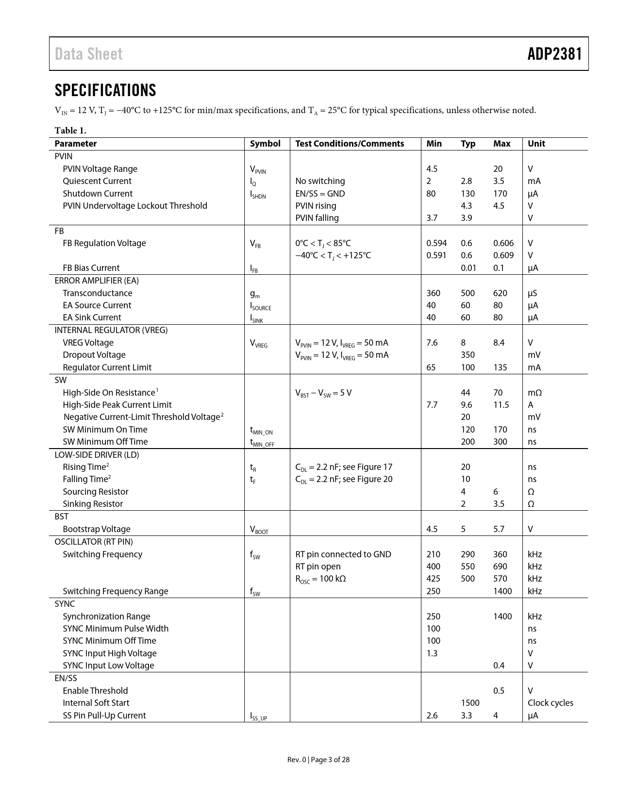 Data Sheet. ADP2381. SPECIFICATIONS. Table 1. Parameter. Symbol. Test Conditions/Comments. Min. Typ. Max. Unit