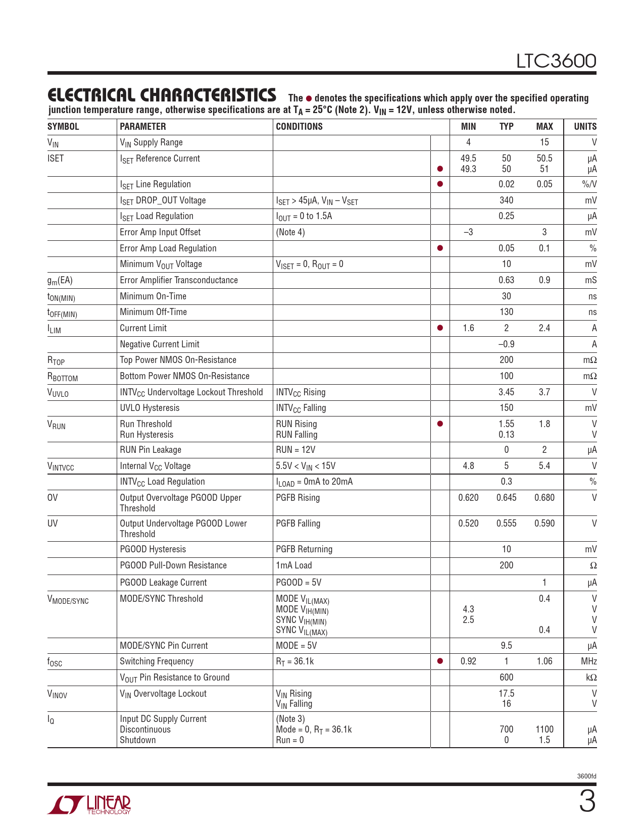 VIN VIN Supply Range 4 15 V ISET ISET Reference Current 49.5 50 50.5 µA l 49.3 50 51 µA ISET Line Regulation l 0.02 0.05 %/V ISET DROP_OUT Voltage ISET > 45µA, VIN – VSET 340 mV ISET Load Regulation IOUT = 0 to 1.5A 0.25 µA Error Amp Input Offset (Note 4) –3 3 mV Error Amp Load Regulation l 0.05 0.1 % Minimum VOUT Voltage VISET = 0, ROUT = 0 10 mV gm(EA) Error Amplifier Transconductance 0.63 0.9 mS tON(MIN) Minimum On-Time 30 ns tOFF(MIN) Minimum Off-Time 130 ns ILIM Current Limit l 1.6 2 2.4 A Negative Current Limit –0.9 A RTOP Top Power NMOS On-Resistance 200 mΩ RBOTTOM Bottom Power NMOS On-Resistance 100 mΩ VUVLO INTVCC Undervoltage Lockout Threshold INTVCC Rising 3.45 3.7 V UVLO Hysteresis INTVCC Falling 150 mV VRUN Run Threshold RUN Rising l 1.55 1.8 V Run Hysteresis RUN Falling 0.13 V RUN Pin Leakage RUN = 12V 0 2 µA VINTVCC Internal VCC Voltage 5.5V < VIN < 15V 4.8 5 5.4 V INTVCC Load Regulation ILOAD = 0mA to 20mA 0.3 % OV Output Overvoltage PGOOD Upper PGFB Rising 0.620 0.645 0.680 V Threshold UV Output Undervoltage PGOOD Lower PGFB Falling 0.520 0.555 0.590 V Threshold PGOOD Hysteresis PGFB Returning 10 mV PGOOD Pull-Down Resistance 1mA Load 200 Ω PGOOD Leakage Current PGOOD = 5V 1 µA VMODE/SYNC MODE/SYNC Threshold MODE VIL(MAX) 0.4 V MODE VIH(MIN) 4.3 V SYNC VIH(MIN) 2.5 V SYNC VIL(MAX) 0.4 V MODE/SYNC Pin Current MODE = 5V 9.5 µA fOSC Switching Frequency RT = 36.1k l 0.92 1 1.06 MHz VOUT Pin Resistance to Ground 600 kΩ VINOV VIN Overvoltage Lockout VIN Rising 17.5 V VIN Falling 16 V IQ Input DC Supply Current (Note 3) Discontinuous Mode = 0, RT = 36.1k 700 1100 µA Shutdown Run = 0 0 1.5 µA 3600fd 3 Document Outline Features Applications Typical Application Description Absolute Maximum Ratings Pin Configuration Order Information Electrical Characteristics Typical Performance Characteristics Pin Functions Functional Diagram Operation Applications Information Typical Applications Package Description Revision History Typical Application Related Parts