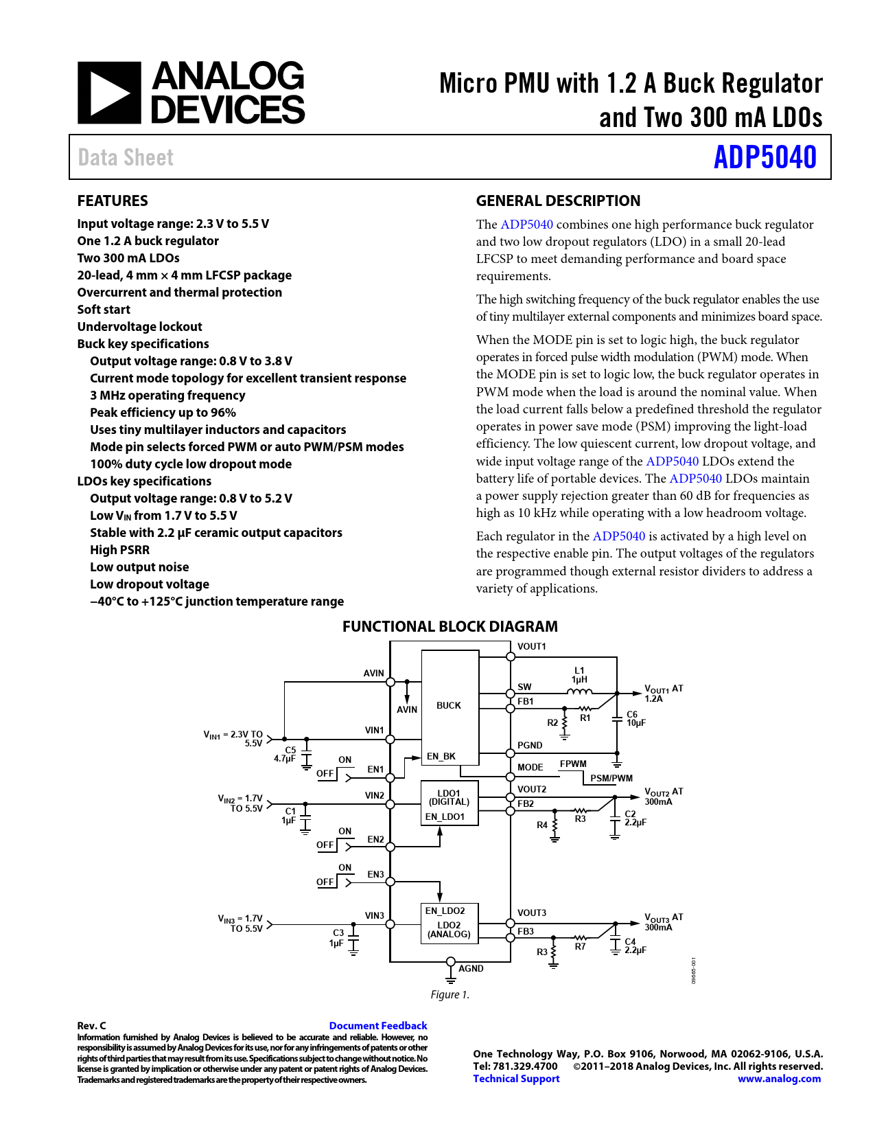 Micro PMU with 1.2 A Buck Regulator. and Two 300 mA LDOs. Data Sheet. ADP5040. FEATURES. GENERAL DESCRIPTION