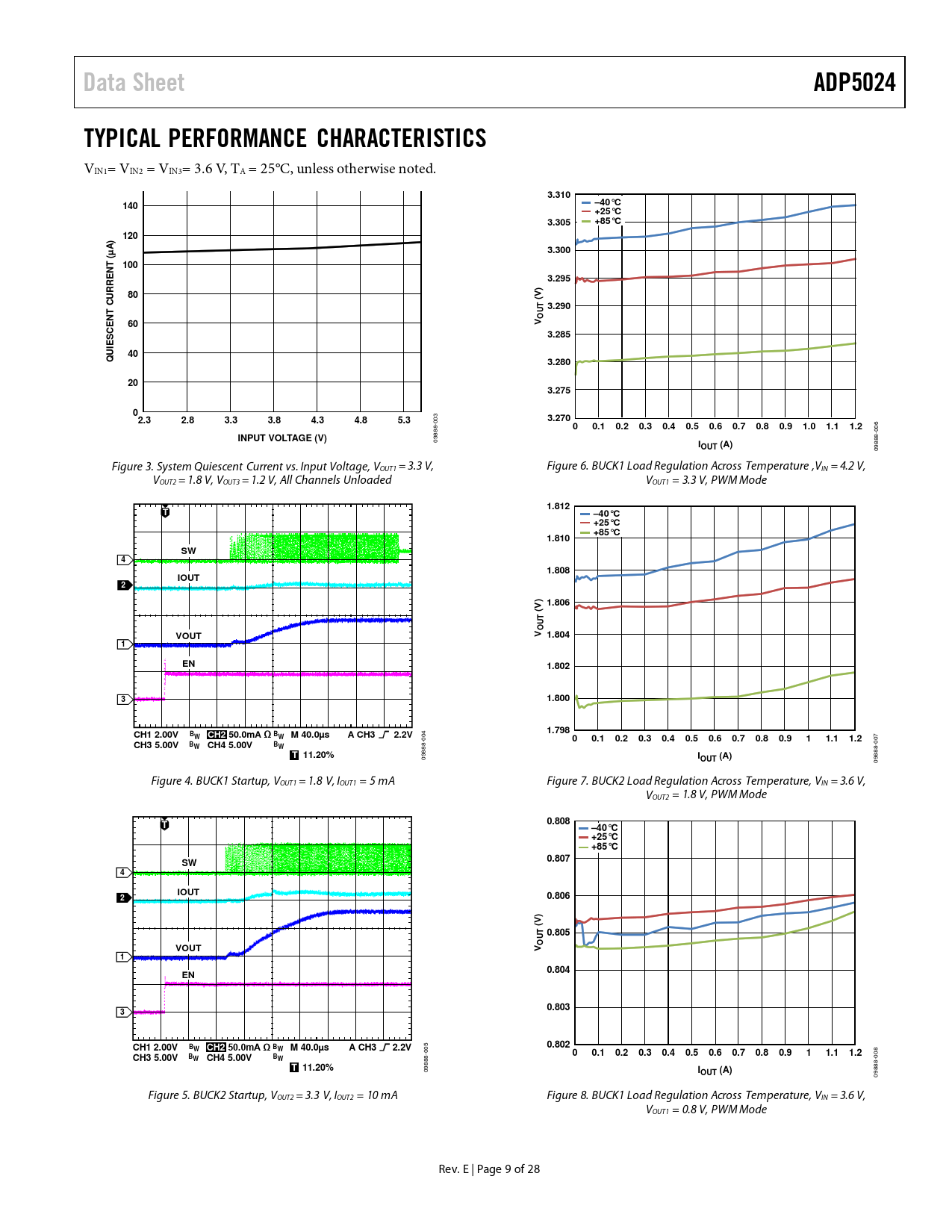Data Sheet. ADP5024. TYPICAL PERFORMANCE CHARACTERISTICS. 3.310. 140. –40°C +25°C. 3.305. +85°C. 120. A) µ. 3.300. 100. 3.295. (V). CURRE. 3.290. CE S