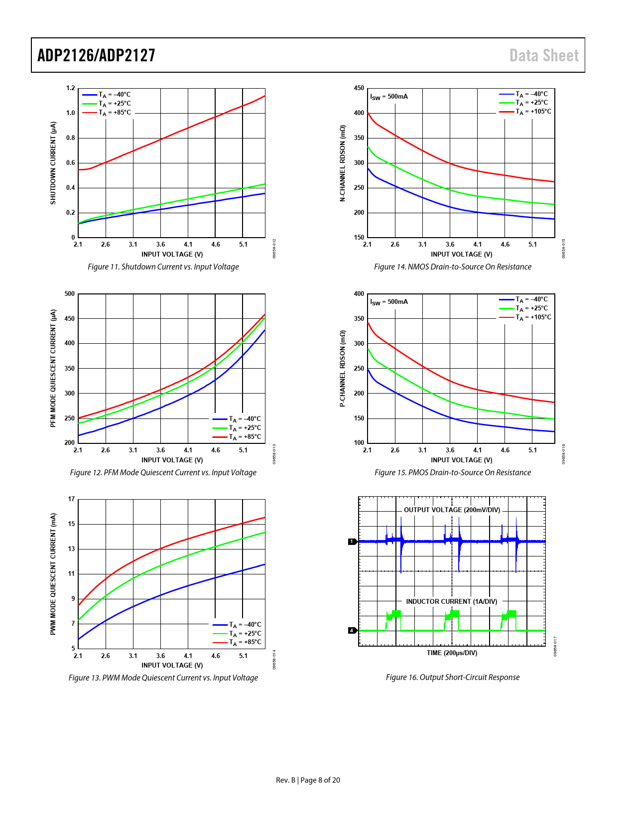 ADP2126/ADP2127. Data Sheet. 1.2. 450. TA = –40°C. A = –40°C. SW = 500mA. TA = +25°C. 1.0. TA = +85°C. 400. TA = +105°C. ) Ω. 0.8. 350. NT E. N ( O S