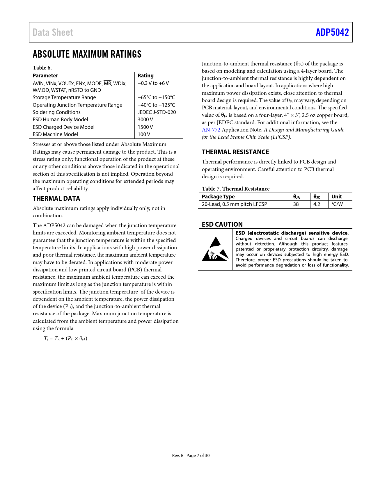 Data Sheet ADP5042 ABSOLUTE MAXIMUM RATINGS Table 6 Parameter Rating THERMAL RESISTANCE Table 7 Thermal Resistance