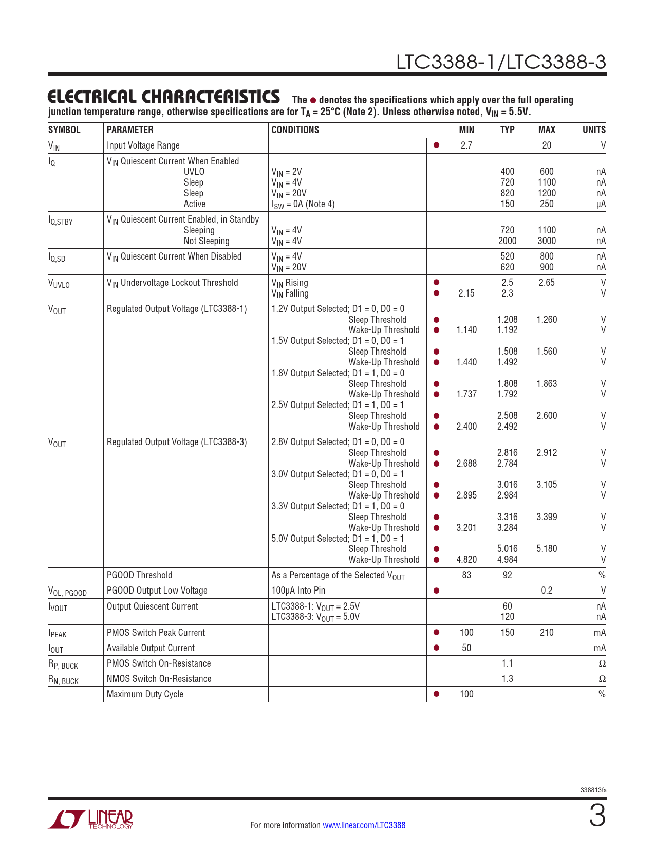 LTC3388-1/LTC3388-3 ELECTRICAL CHARACTERISTICSThe l denotes the specifications which apply over the full operatingjunction temperature range, otherwise specifications are for TA = 25°C (Note 2). Unless otherwise noted, VIN = 5.5V. SYMBOLPARAMETERCONDITIONSMINTYPMAXUNITS VIN Input Voltage Range l 2.7 20 V IQ VIN Quiescent Current When Enabled UVLO VIN = 2V 400 600 nA Sleep VIN = 4V 720 1100 nA Sleep VIN = 20V 820 1200 nA Active ISW = 0A (Note 4) 150 250 µA IQ,STBY VIN Quiescent Current Enabled, in Standby Sleeping VIN = 4V 720 1100 nA Not Sleeping VIN = 4V 2000 3000 nA IQ,SD VIN Quiescent Current When Disabled VIN = 4V 520 800 nA VIN = 20V 620 900 nA VUVLO VIN Undervoltage Lockout Threshold VIN Rising l 2.5 2.65 V VIN Falling l 2.15 2.3 V VOUT Regulated Output Voltage (LTC3388-1) 1.2V Output Selected; D1 = 0, D0 = 0 Sleep Threshold l 1.208 1.260 V Wake-Up Threshold l 1.140 1.192 V 1.5V Output Selected; D1 = 0, D0 = 1 Sleep Threshold l 1.508 1.560 V Wake-Up Threshold l 1.440 1.492 V 1.8V Output Selected; D1 = 1, D0 = 0 Sleep Threshold l 1.808 1.863 V Wake-Up Threshold l 1.737 1.792 V 2.5V Output Selected; D1 = 1, D0 = 1 Sleep Threshold l 2.508 2.600 V Wake-Up Threshold l 2.400 2.492 V VOUT Regulated Output Voltage (LTC3388-3) 2.8V Output Selected; D1 = 0, D0 = 0 Sleep Threshold l 2.816 2.912 V Wake-Up Threshold l 2.688 2.784 V 3.0V Output Selected; D1 = 0, D0 = 1 Sleep Threshold l 3.016 3.105 V Wake-Up Threshold l 2.895 2.984 V 3.3V Output Selected; D1 = 1, D0 = 0 Sleep Threshold l 3.316 3.399 V Wake-Up Threshold l 3.201 3.284 V 5.0V Output Selected; D1 = 1, D0 = 1 Sleep Threshold l 5.016 5.180 V Wake-Up Threshold l 4.820 4.984 V PGOOD Threshold As a Percentage of the Selected VOUT 83 92 % VOL, PGOOD PGOOD Output Low Voltage 100µA Into Pin l 0.2 V IVOUT Output Quiescent Current LTC3388-1: VOUT = 2.5V 60 nA LTC3388-3: VOUT = 5.0V 120 nA IPEAK PMOS Switch Peak Current l 100 150 210 mA IOUT Available Output Current l 50 mA RP, BUCK PMOS Switch On-Resistance 1.1 Ω RN, BUCK NMOS Switch On-Resistance 1.3 Ω Maximum Duty Cycle l 100 % 338813fa For more information www.linear.com/LTC3388 3 Document Outline Features Applications Description Typical Application Absolute Maximum Ratings Pin Configuration Order Information Electrical Characteristics Typical Performance Characteristics Pin Functions Block Diagram Operation Applications Information Typical Application Related Parts