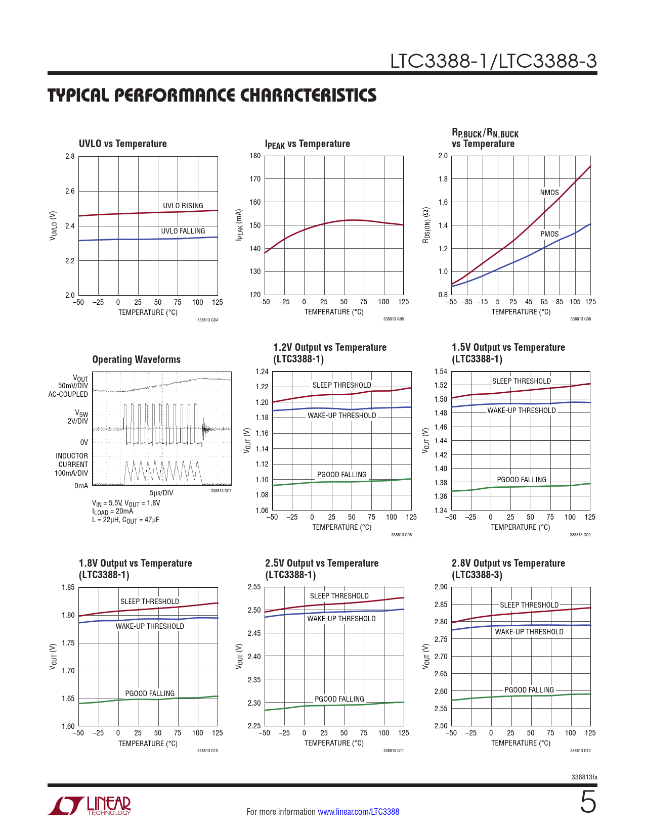 2.8 180 2.0 170 1.8 2.6 NMOS UVLO RISING 160 1.6 (V) (Ω) 2.4 (mA) 150 1.4 UVLO FALLING V UVLO I PEAK PMOS R DS(ON) 140 1.2 2.2 130 1.0 2.0 120 0.8 –50 –25 0 25 50 75 100 125 –50 –25 0 25 50 75 100 125 –55 –35 –15 5 25 45 65 85 105 125 TEMPERATURE (°C) TEMPERATURE (°C) TEMPERATURE (°C) 338813 G04 338813 G05 338813 G06
