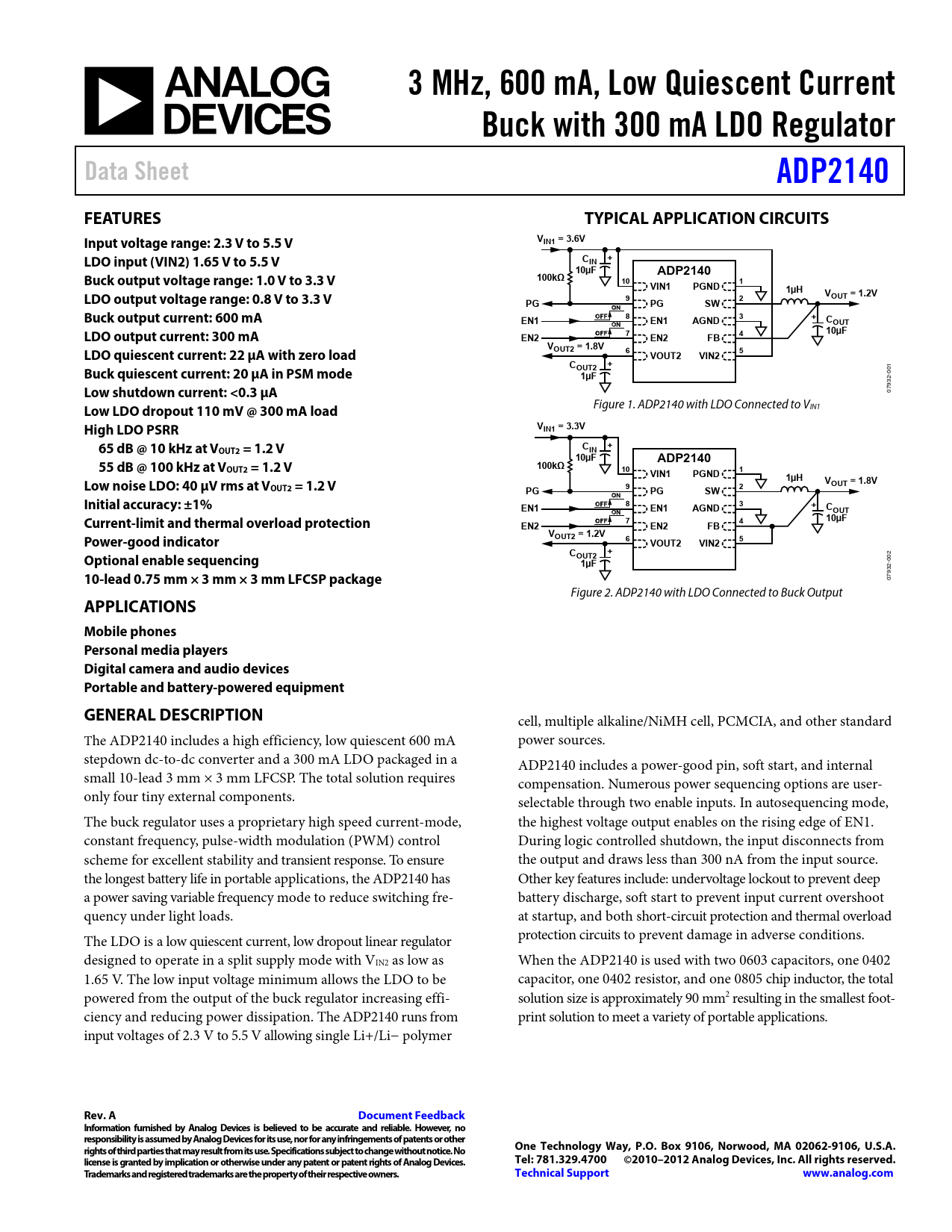 3 MHz, 600 mA, Low Quiescent Current. Buck with 300 mA LDO Regulator. Data Sheet. ADP2140. FEATURES. TYPICAL APPLICATION CIRCUITS