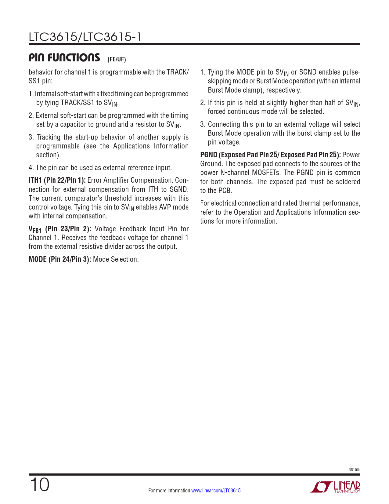 LTC3615/LTC3615-1 pin FuncTions (FE/UF) behavior for channel 1 is programmable with the TRACK/ 1. Tying the MODE pin to SVIN or SGND enables pulse- SS1 pin: skipping mode or Burst Mode operation (with an internal 1. Internal soft-start with a fixed timing can be programmed Burst Mode clamp), respectively. by tying TRACK/SS1 to SVIN. 2. If this pin is held at slightly higher than half of SVIN, 2. External soft-start can be programmed with the timing forced continuous mode will be selected. set by a capacitor to ground and a resistor to SVIN. 3. Connecting this pin to an external voltage will select 3. Tracking the start-up behavior of another supply is Burst Mode operation with the burst clamp set to the programmable (see the Applications Information pin voltage. section). PGND (Exposed Pad Pin 25/ Exposed Pad Pin 25): Power 4. The pin can be used as external reference input. Ground. The exposed pad connects to the sources of the power N-channel MOSFETs. The PGND pin is common ITH1 (Pin 22/Pin 1): Error Amplifier Compensation. Con- for both channels. The exposed pad must be soldered nection for external compensation from ITH to SGND. to the PCB. The current comparator’s threshold increases with this control voltage. Tying this pin to SV For electrical connection and rated thermal performance, IN enables AVP mode with internal compensation. refer to the Operation and Applications Information sec- tions for more information. VFB1 (Pin 23/Pin 2): Voltage Feedback Input Pin for Channel 1. Receives the feedback voltage for channel 1 from the external resistive divider across the output. MODE (Pin 24/Pin 3): Mode Selection. 3615fb 10 For more information www.linear.com/LTC3615 Document Outline Features Applications Description Typical Application Absolute Maximum Ratings Pin Configuration Order Information Electrical Characteristics Typical Performance Characteristics Pin Functions Functional Block Diagram Operation Applications Information Typical Applications Package Description Revision History Typical Application Related Parts