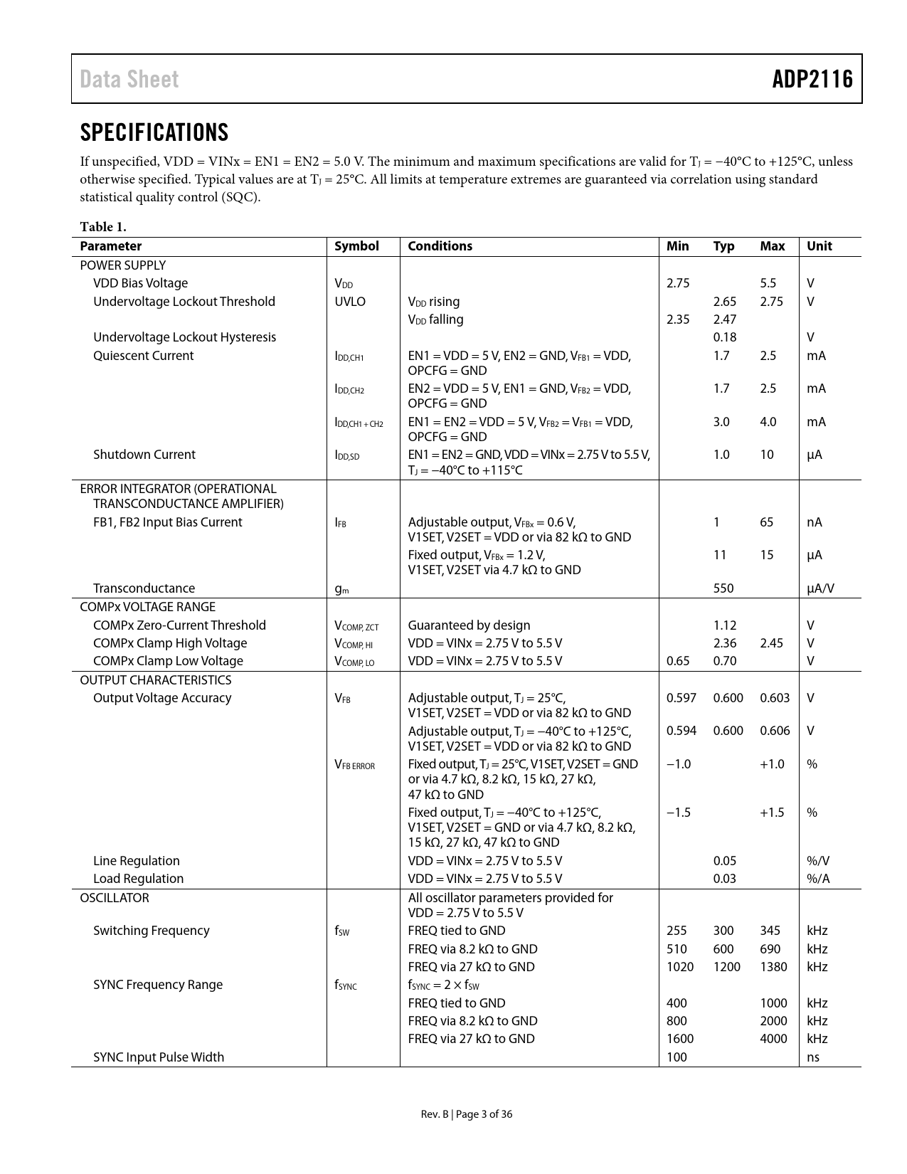 Data SheetADP2116SPECIFICATIONS If unspecified, VDD = VINx = EN1 = EN2 = 5.0 V. The minimum and maximum specifications are valid for TJ = −40°C to +125°C, unless otherwise specified. Typical values are at TJ = 25°C. All limits at temperature extremes are guaranteed via correlation using standard statistical quality control (SQC). Table 1. Parameter SymbolConditions MinTypMaxUnit POWER SUPPLY VDD Bias Voltage VDD 2.75 5.5 V Undervoltage Lockout Threshold UVLO VDD rising 2.65 2.75 V VDD falling 2.35 2.47 Undervoltage Lockout Hysteresis 0.18 V Quiescent Current IDD,CH1 EN1 = VDD = 5 V, EN2 = GND, VFB1 = VDD, 1.7 2.5 mA OPCFG = GND IDD,CH2 EN2 = VDD = 5 V, EN1 = GND, VFB2 = VDD, 1.7 2.5 mA OPCFG = GND IDD,CH1 + CH2 EN1 = EN2 = VDD = 5 V, VFB2 = VFB1 = VDD, 3.0 4.0 mA OPCFG = GND Shutdown Current IDD,SD EN1 = EN2 = GND, VDD = VINx = 2.75 V to 5.5 V, 1.0 10 μA TJ = −40°C to +115°C ERROR INTEGRATOR (OPERATIONAL TRANSCONDUCTANCE AMPLIFIER) FB1, FB2 Input Bias Current IFB Adjustable output, VFBx = 0.6 V, 1 65 nA V1SET, V2SET = VDD or via 82 kΩ to GND Fixed output, VFBx = 1.2 V, 11 15 μA V1SET, V2SET via 4.7 kΩ to GND Transconductance gm 550 μA/V COMPx VOLTAGE RANGE COMPx Zero-Current Threshold VCOMP, ZCT Guaranteed by design 1.12 V COMPx Clamp High Voltage VCOMP, HI VDD = VINx = 2.75 V to 5.5 V 2.36 2.45 V COMPx Clamp Low Voltage VCOMP, LO VDD = VINx = 2.75 V to 5.5 V 0.65 0.70 V OUTPUT CHARACTERISTICS Output Voltage Accuracy VFB Adjustable output, TJ = 25°C, 0.597 0.600 0.603 V V1SET, V2SET = VDD or via 82 kΩ to GND Adjustable output, TJ = −40°C to +125°C, 0.594 0.600 0.606 V V1SET, V2SET = VDD or via 82 kΩ to GND VFB ERROR Fixed output, TJ = 25°C, V1SET, V2SET = GND −1.0 +1.0 % or via 4.7 kΩ, 8.2 kΩ, 15 kΩ, 27 kΩ, 47 kΩ to GND Fixed output, TJ = −40°C to +125°C, −1.5 +1.5 % V1SET, V2SET = GND or via 4.7 kΩ, 8.2 kΩ, 15 kΩ, 27 kΩ, 47 kΩ to GND Line Regulation VDD = VINx = 2.75 V to 5.5 V 0.05 %/V Load Regulation VDD = VINx = 2.75 V to 5.5 V 0.03 %/A OSCILLATOR All oscillator parameters provided for VDD = 2.75 V to 5.5 V Switching Frequency fSW FREQ tied to GND 255 300 345 kHz FREQ via 8.2 kΩ to GND 510 600 690 kHz FREQ via 27 kΩ to GND 1020 1200 1380 kHz SYNC Frequency Range fSYNC fSYNC = 2 × fSW FREQ tied to GND 400 1000 kHz FREQ via 8.2 kΩ to GND 800 2000 kHz FREQ via 27 kΩ to GND 1600 4000 kHz SYNC Input Pulse Width 100 ns Rev. B | Page 3 of 36 Document Outline FEATURES APPLICATIONS GENERAL DESCRIPTION TYPICAL APPLICATION CIRCUIT TABLE OF CONTENTS REVISION HISTORY SPECIFICATIONS ABSOLUTE MAXIMUM RATINGS ESD CAUTION PIN CONFIGURATION AND FUNCTION DESCRIPTIONS TYPICAL PERFORMANCE CHARACTERISTICS LINE AND LOAD REGULATION SUPPLY CURRENT LOAD TRANSIENT RESPONSE BASIC FUNCTIONALITY BODE PLOTS SIMPLIFIED BLOCK DIAGRAM THEORY OF OPERATION CONTROL ARCHITECTURE UNDERVOLTAGE LOCKOUT (UVLO) ENABLE/DISABLE CONTROL SOFT START POWER GOOD PULSE SKIP MODE HICCUP MODE CURRENT LIMIT THERMAL OVERLOAD PROTECTION MAXIMUM DUTY CYCLE OPERATION SYNCHRONIZATION CONVERTER CONFIGURATION SELECTING THE OUTPUT VOLTAGE SETTING THE OSCILLATOR FREQUENCY SYNCHRONIZATION AND CLKOUT OPERATION MODE CONFIGURATION EXTERNAL COMPONENTS SELECTION ADIsimPower DESIGN TOOL INPUT CAPACITOR SELECTION VDD RC FILTER INDUCTOR SELECTION OUTPUT CAPACITOR SELECTION CONTROL LOOP COMPENSATION DESIGN EXAMPLE CHANNEL 1 CONFIGURATION AND COMPONENTS SELECTION CHANNEL 2 CONFIGURATION AND COMPONENTS SELECTION SYSTEM CONFIGURATION APPLICATION CIRCUITS POWER DISSIPATION AND THERMAL CONSIDERATIONS CIRCUIT BOARD LAYOUT RECOMMENDATIONS OUTLINE DIMENSIONS ORDERING GUIDE
