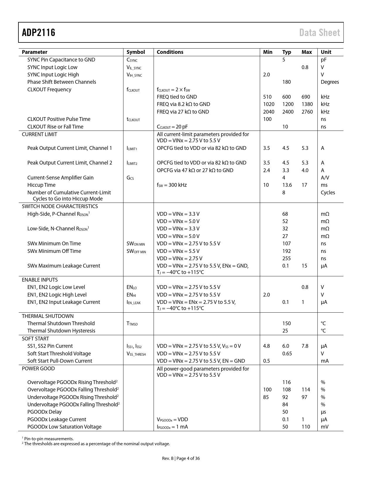 ADP2116Data SheetParameter SymbolConditions MinTypMaxUnit SYNC Pin Capacitance to GND CSYNC 5 pF SYNC Input Logic Low VIL_SYNC 0.8 V SYNC Input Logic High VIH_SYNC 2.0 V Phase Shift Between Channels 180 Degrees CLKOUT Frequency fCLKOUT fCLKOUT = 2 × fSW FREQ tied to GND 510 600 690 kHz FREQ via 8.2 kΩ to GND 1020 1200 1380 kHz FREQ via 27 kΩ to GND 2040 2400 2760 kHz CLKOUT Positive Pulse Time tCLKOUT 100 ns CLKOUT Rise or Fall Time CCLKOUT = 20 pF 10 ns CURRENT LIMIT All current-limit parameters provided for VDD = VINx = 2.75 V to 5.5 V Peak Output Current Limit, Channel 1 ILIMIT1 OPCFG tied to VDD or via 82 kΩ to GND 3.5 4.5 5.3 A Peak Output Current Limit, Channel 2 ILIMIT2 OPCFG tied to VDD or via 82 kΩ to GND 3.5 4.5 5.3 A OPCFG via 47 kΩ or 27 kΩ to GND 2.4 3.3 4.0 A Current-Sense Amplifier Gain GCS 4 A/V Hiccup Time fSW = 300 kHz 10 13.6 17 ms Number of Cumulative Current-Limit 8 Cycles Cycles to Go into Hiccup Mode SWITCH NODE CHARACTERISTICS High-Side, P-Channel R 1 DSON VDD = VINx = 3.3 V 68 mΩ VDD = VINx = 5.0 V 52 mΩ Low-Side, N-Channel R 1 DSON VDD = VINx = 3.3 V 32 mΩ VDD = VINx = 5.0 V 27 mΩ SWx Minimum On Time SWON MIN VDD = VINx = 2.75 V to 5.5 V 107 ns SWx Minimum Off Time SWOFF MIN VDD = VINx = 5.5 V 192 ns VDD = VINx = 2.75 V 255 ns SWx Maximum Leakage Current VDD = VINx = 2.75 V to 5.5 V, ENx = GND, 0.1 15 μA TJ = −40°C to +115°C ENABLE INPUTS EN1, EN2 Logic Low Level ENLO VDD = VINx = 2.75 V to 5.5 V 0.8 V EN1, EN2 Logic High Level ENHI VDD = VINx = 2.75 V to 5.5 V 2.0 V EN1, EN2 Input Leakage Current IEN_LEAK VDD = VINx = ENx = 2.75 V to 5.5 V, 0.1 1 μA TJ = −40°C to +115°C THERMAL SHUTDOWN Thermal Shutdown Threshold TTMSD 150 °C Thermal Shutdown Hysteresis 25 °C SOFT START SS1, SS2 Pin Current ISS1, ISS2 VDD = VINx = 2.75 V to 5.5 V, VSS = 0 V 4.8 6.0 7.8 μA Soft Start Threshold Voltage VSS_THRESH VDD = VINx = 2.75 V to 5.5 V 0.65 V Soft Start Pull-Down Current VDD = VINx = 2.75 V to 5.5 V, EN = GND 0.5 mA POWER GOOD All power-good parameters provided for VDD = VINx = 2.75 V to 5.5 V Overvoltage PGOODx Rising Threshold2 116 % Overvoltage PGOODx Falling Threshold2 100 108 114 % Undervoltage PGOODx Rising Threshold2 85 92 97 % Undervoltage PGOODx Falling Threshold2 84 % PGOODx Delay 50 μs PGOODx Leakage Current VPGOODx = VDD 0.1 1 μA PGOODx Low Saturation Voltage IPGOODx = 1 mA 50 110 mV 1 Pin-to-pin measurements. 2 The thresholds are expressed as a percentage of the nominal output voltage. Rev. B | Page 4 of 36 Document Outline FEATURES APPLICATIONS GENERAL DESCRIPTION TYPICAL APPLICATION CIRCUIT TABLE OF CONTENTS REVISION HISTORY SPECIFICATIONS ABSOLUTE MAXIMUM RATINGS ESD CAUTION PIN CONFIGURATION AND FUNCTION DESCRIPTIONS TYPICAL PERFORMANCE CHARACTERISTICS LINE AND LOAD REGULATION SUPPLY CURRENT LOAD TRANSIENT RESPONSE BASIC FUNCTIONALITY BODE PLOTS SIMPLIFIED BLOCK DIAGRAM THEORY OF OPERATION CONTROL ARCHITECTURE UNDERVOLTAGE LOCKOUT (UVLO) ENABLE/DISABLE CONTROL SOFT START POWER GOOD PULSE SKIP MODE HICCUP MODE CURRENT LIMIT THERMAL OVERLOAD PROTECTION MAXIMUM DUTY CYCLE OPERATION SYNCHRONIZATION CONVERTER CONFIGURATION SELECTING THE OUTPUT VOLTAGE SETTING THE OSCILLATOR FREQUENCY SYNCHRONIZATION AND CLKOUT OPERATION MODE CONFIGURATION EXTERNAL COMPONENTS SELECTION ADIsimPower DESIGN TOOL INPUT CAPACITOR SELECTION VDD RC FILTER INDUCTOR SELECTION OUTPUT CAPACITOR SELECTION CONTROL LOOP COMPENSATION DESIGN EXAMPLE CHANNEL 1 CONFIGURATION AND COMPONENTS SELECTION CHANNEL 2 CONFIGURATION AND COMPONENTS SELECTION SYSTEM CONFIGURATION APPLICATION CIRCUITS POWER DISSIPATION AND THERMAL CONSIDERATIONS CIRCUIT BOARD LAYOUT RECOMMENDATIONS OUTLINE DIMENSIONS ORDERING GUIDE