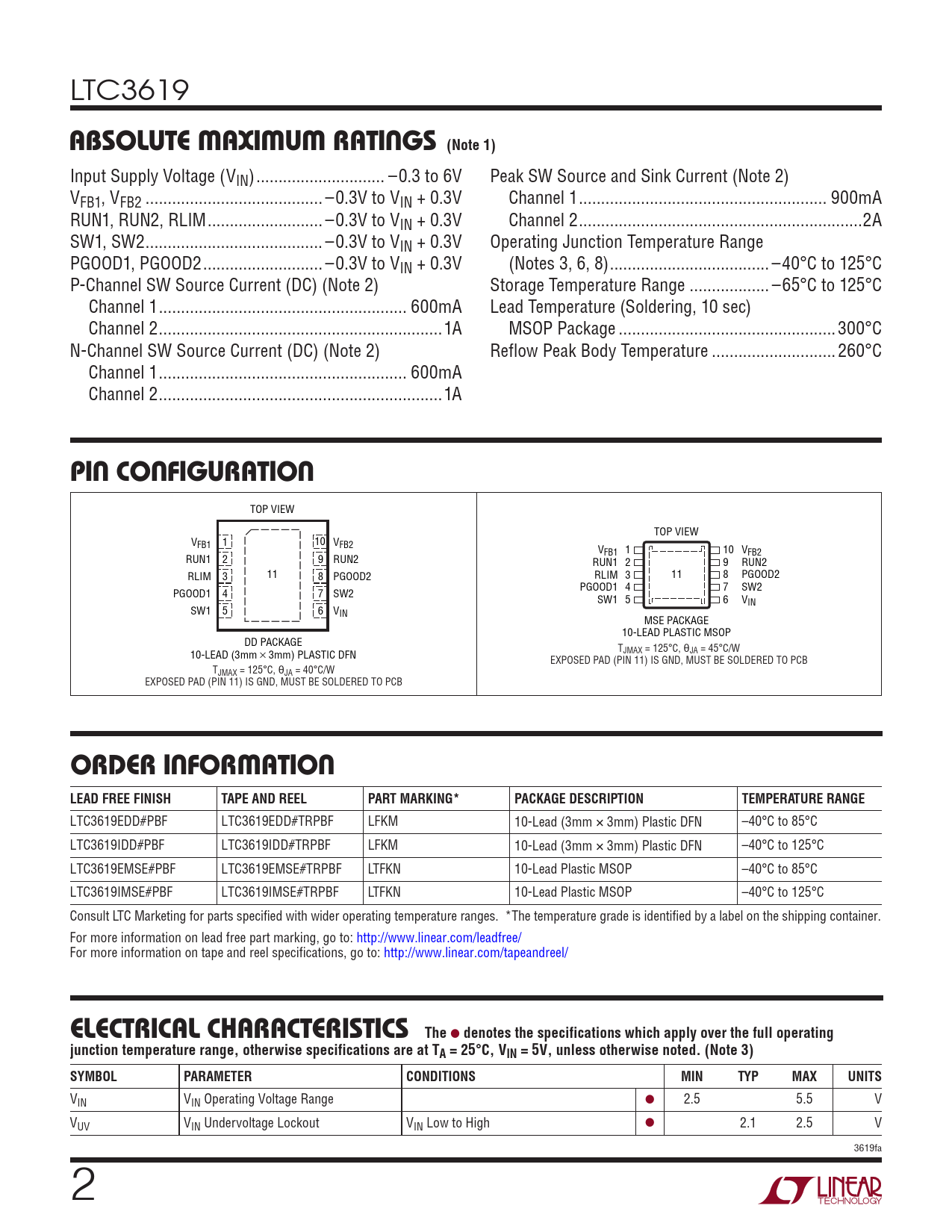 LTC3619EDD#PBF LTC3619EDD#TRPBF LFKM 10-Lead (3mm × 3mm) Plastic DFN –40°C to 85°C LTC3619IDD#PBF LTC3619IDD#TRPBF LFKM 10-Lead (3mm × 3mm) Plastic DFN –40°C to 125°C LTC3619EMSE#PBF LTC3619EMSE#TRPBF LTFKN 10-Lead Plastic MSOP –40°C to 85°C LTC3619IMSE#PBF LTC3619IMSE#TRPBF LTFKN 10-Lead Plastic MSOP –40°C to 125°C Consult LTC Marketing for parts specified with wider operating temperature ranges. *The temperature grade is identified by a label on the shipping container. For more information on lead free part marking, go to: http://www.linear.com/leadfree/ For more information on tape and reel specifications, go to: http://www.linear.com/tapeandreel/