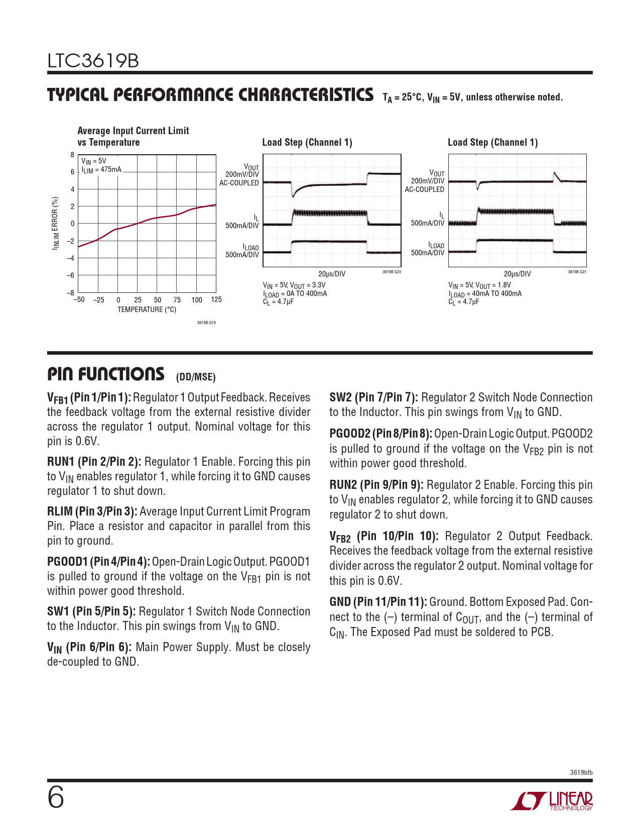 LTC3619B Typical perForMance characTerisTics TA = 25°C, VIN = 5V, unless otherwise noted.Average Input Current Limitvs TemperatureLoad Step (Channel 1)Load Step (Channel 1) 8 VIN = 5V V 6 ILIM = 475mA OUT 200mV/DIV VOUT AC-COUPLED 200mV/DIV 4 AC-COUPLED 2 I I L L 0 500mA/DIV 500mA/DIV ERROR (%) –2 I INLIM I I LOAD LOAD 500mA/DIV –4 500mA/DIV –6 20µs/DIV 3619B G20 20µs/DIV 3619B G21 VIN = 5V, VOUT = 3.3V VIN = 5V, VOUT = 1.8V –8 I I –50 LOAD = 0A TO 400mA LOAD = 40mA TO 400mA –25 0 25 50 75 100 125 CL = 4.7µF CL = 4.7µF TEMPERATURE (°C) 3619B G19 pin FuncTions (DD/MSE) VFB1 (Pin 1/Pin 1): Regulator 1 Output Feedback. Receives SW2 (Pin 7/Pin 7): Regulator 2 Switch Node Connection the feedback voltage from the external resistive divider to the Inductor. This pin swings from VIN to GND. across the regulator 1 output. Nominal voltage for this pin is 0.6V. PGOOD2 (Pin 8/Pin 8): Open-Drain Logic Output. PGOOD2 is pulled to ground if the voltage on the VFB2 pin is not RUN1 (Pin 2/Pin 2): Regulator 1 Enable. Forcing this pin within power good threshold. to VIN enables regulator 1, while forcing it to GND causes regulator 1 to shut down. RUN2 (Pin 9/Pin 9): Regulator 2 Enable. Forcing this pin to VIN enables regulator 2, while forcing it to GND causes RLIM (Pin 3/Pin 3): Average Input Current Limit Program regulator 2 to shut down. Pin. Place a resistor and capacitor in parallel from this pin to ground. VFB2 (Pin 10/Pin 10): Regulator 2 Output Feedback. Receives the feedback voltage from the external resistive PGOOD1 (Pin 4/Pin 4): Open-Drain Logic Output. PGOOD1 divider across the regulator 2 output. Nominal voltage for is pulled to ground if the voltage on the VFB1 pin is not this pin is 0.6V. within power good threshold. GND (Pin 11/Pin 11): Ground. Bottom Exposed Pad. Con- SW1 (Pin 5/Pin 5): Regulator 1 Switch Node Connection nect to the (–) terminal of C to the Inductor. This pin swings from V OUT, and the (–) terminal of IN to GND. CIN. The Exposed Pad must be soldered to PCB. VIN (Pin 6/Pin 6): Main Power Supply. Must be closely de-coupled to GND. 3619bfb 6 Document Outline Features Applications Description Typical Application Absolute Maximum Ratings Pin Configuration Order Information Electrical Characteristics Typical Performance Characteristics Pin Functions Functional Diagram Operation Applications Information Package Description Revision History Typical Applications Related Parts