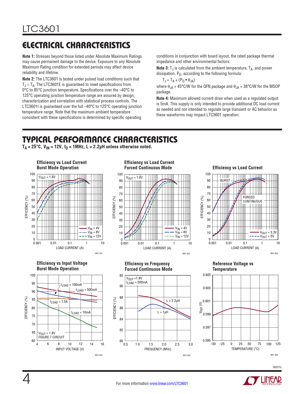 LTC3601 ELECTRICAL CHARACTERISTICS Note 1: Stresses beyond those listed under Absolute Maximum Ratings conditions in conjunction with board layout, the rated package thermal may cause permanent damage to the device. Exposure to any Absolute impedance and other environmental factors. Maximum Rating condition for extended periods may affect device Note 3: TJ is calculated from the ambient temperature, TA, and power reliability and lifetime. dissipation, PD, according to the following formula: Note 2: The LTC3601 is tested under pulsed load conditions such that TJ = TA + (PD • θJA) TJ ≈ TA. The LTC3601E is guaranteed to meet specifications from where θ 0°C to 85°C junction temperature. Specifications over the –40°C to JA = 45°C/W for the QFN package and θJA = 38°C/W for the MSOP package. 125°C operating junction temperature range are assured by design, characterization and correlation with statistical process controls. The Note 4: Maximum allowed current draw when used as a regulated output LTC3601I is guaranteed over the full –40°C to 125°C operating junction is 5mA. This supply is only intended to provide additional DC load current temperature range. Note that the maximum ambient temperature as needed and not intended to regulate large transient or AC behavior as consistent with these specifications is determined by specific operating these waveforms may impact LTC3601 operation. TYPICAL PERFORMANCE CHARACTERISTICSTA = 25°C, VIN = 12V, fO = 1MHz, L = 2.2µH unless otherwise noted.Efficiency vs Load CurrentEfficiency vs Load CurrentBurst Mode OperationForced Continuous ModeEfficiency vs Load Current 100 100 100 VOUT = 1.8V V 90 OUT = 1.8V 90 90 BURST 80 80 80 70 70 70 FORCED 60 60 60 CONTINUOUS 50 50 50 40 40 40 EFFICIENCY (%) EFFICIENCY (%) EFFICIENCY (%) 30 30 30 20 V 20 20 IN = 4V VIN = 4V 10 VIN = 8V 10 VIN = 8V 10 VOUT = 3.3V VIN = 12V VIN = 12V VOUT = 5V 0 0 0 0.001 0.01 0.1 1 10 0.001 0.01 0.1 1 10 0.001 0.01 0.1 1 10 LOAD CURRENT (A) LOAD CURRENT (A) LOAD CURRENT (A) 3601 G01 3601 G02 3601 G03 Efficiency vs Input VoltageEfficiency vs FrequencyReference Voltage vsBurst Mode OperationForced Continuous ModeTemperature 100 92 0.605 VOUT =1.8V 95 I I LOAD = 500mA LOAD = 100mA 90 0.603 90 ILOAD = 500mA 85 88 I L = 2.2µH LOAD = 1.5A 0.601 (V) 80 86 ILOAD = 10mA L = 1µH V REF 0.599 EFFICIENCY (%) 75 EFFICIENCY (%) 84 70 0.597 82 65 VOUT = 1.8V FIGURE 7 CIRCUIT 60 80 0.595 4 6 8 10 12 14 16 0.5 1.0 1.5 2.0 2.5 3.0 –50 –25 0 25 50 75 100 125 INPUT VOLTAGE (V) FREQUENCY (MHz) TEMPERATURE (°C) 3601 G04 3601 G05 3601 G06 3601fc 4 For more information www.linear.com/LTC3601 Document Outline Features Description Applications Typical Application Absolute Maximum Ratings Pin Configuration Electrical Characteristics Typical Performance Characteristics Pin Functions Block Diagram Operation Applications Information Related Parts
