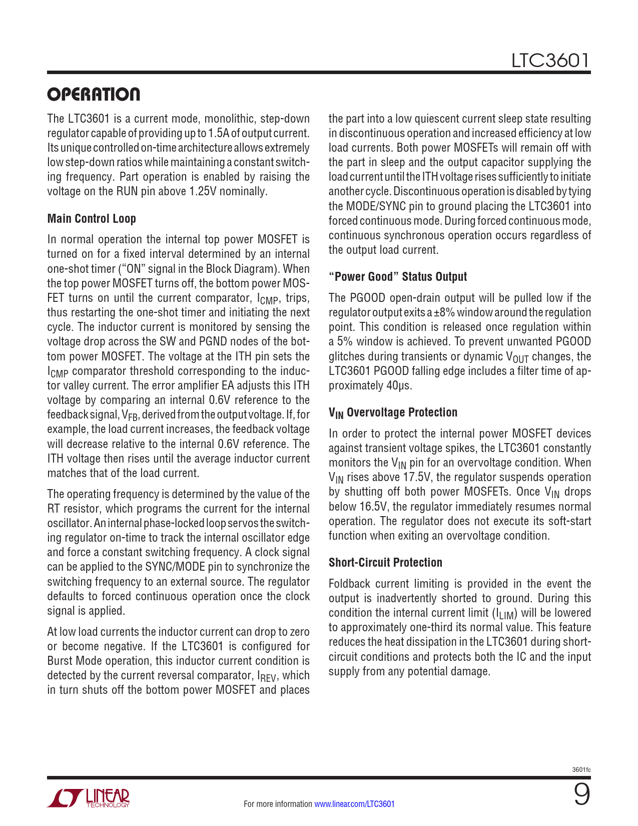 LTC3601 OPERATION The LTC3601 is a current mode, monolithic, step-down the part into a low quiescent current sleep state resulting regulator capable of providing up to 1.5A of output current. in discontinuous operation and increased efficiency at low Its unique controlled on-time architecture allows extremely load currents. Both power MOSFETs will remain off with low step-down ratios while maintaining a constant switch- the part in sleep and the output capacitor supplying the ing frequency. Part operation is enabled by raising the load current until the ITH voltage rises sufficiently to initiate voltage on the RUN pin above 1.25V nominally. another cycle. Discontinuous operation is disabled by tying the MODE/SYNC pin to ground placing the LTC3601 into Main Control Loop forced continuous mode. During forced continuous mode, In normal operation the internal top power MOSFET is continuous synchronous operation occurs regardless of turned on for a fixed interval determined by an internal the output load current. one-shot timer (“ON” signal in the Block Diagram). When the top power MOSFET turns off, the bottom power MOS- “Power Good” Status Output FET turns on until the current comparator, ICMP , trips, The PGOOD open-drain output will be pulled low if the thus restarting the one-shot timer and initiating the next regulator output exits a ±8% window around the regulation cycle. The inductor current is monitored by sensing the point. This condition is released once regulation within voltage drop across the SW and PGND nodes of the bot- a 5% window is achieved. To prevent unwanted PGOOD tom power MOSFET. The voltage at the ITH pin sets the glitches during transients or dynamic VOUT changes, the ICMP comparator threshold corresponding to the induc- LTC3601 PGOOD falling edge includes a filter time of ap- tor valley current. The error amplifier EA adjusts this ITH proximately 40µs. voltage by comparing an internal 0.6V reference to the feedback signal, VFB, derived from the output voltage. If, for VIN Overvoltage Protection example, the load current increases, the feedback voltage In order to protect the internal power MOSFET devices will decrease relative to the internal 0.6V reference. The against transient voltage spikes, the LTC3601 constantly ITH voltage then rises until the average inductor current monitors the V matches that of the load current. IN pin for an overvoltage condition. When VIN rises above 17.5V, the regulator suspends operation The operating frequency is determined by the value of the by shutting off both power MOSFETs. Once VIN drops RT resistor, which programs the current for the internal below 16.5V, the regulator immediately resumes normal oscillator. An internal phase-locked loop servos the switch- operation. The regulator does not execute its soft-start ing regulator on-time to track the internal oscillator edge function when exiting an overvoltage condition. and force a constant switching frequency. A clock signal can be applied to the SYNC/MODE pin to synchronize the Short-Circuit Protection switching frequency to an external source. The regulator Foldback current limiting is provided in the event the defaults to forced continuous operation once the clock output is inadvertently shorted to ground. During this signal is applied. condition the internal current limit (ILIM) will be lowered At low load currents the inductor current can drop to zero to approximately one-third its normal value. This feature or become negative. If the LTC3601 is configured for reduces the heat dissipation in the LTC3601 during short- Burst Mode operation, this inductor current condition is circuit conditions and protects both the IC and the input detected by the current reversal comparator, I supply from any potential damage. REV , which in turn shuts off the bottom power MOSFET and places 3601fc For more information www.linear.com/LTC3601 9 Document Outline Features Description Applications Typical Application Absolute Maximum Ratings Pin Configuration Electrical Characteristics Typical Performance Characteristics Pin Functions Block Diagram Operation Applications Information Related Parts