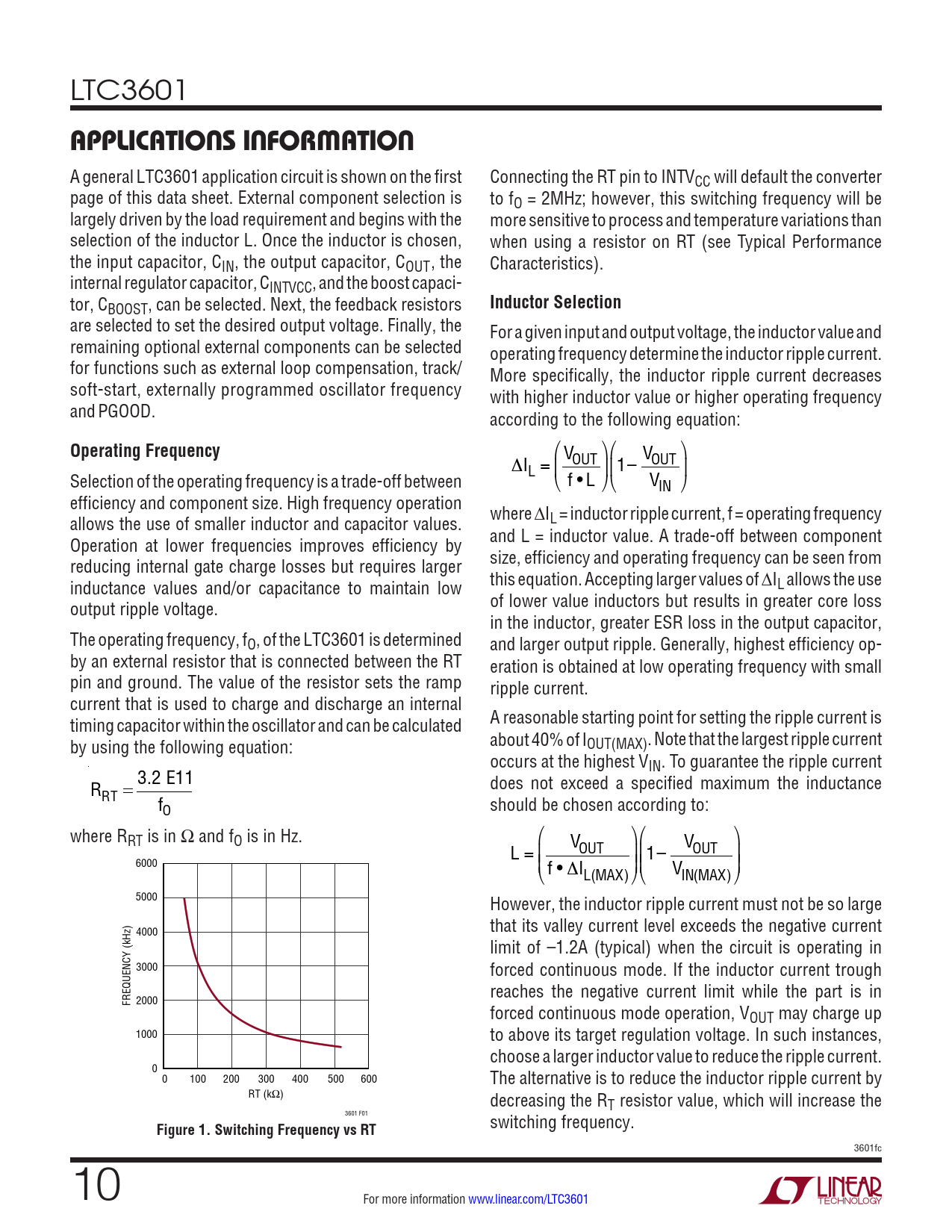 A general LTC3601 application circuit is shown on the first Connecting the RT pin to INTVCC will default the converter page of this data sheet. External component selection is to fO = 2MHz; however, this switching frequency will be largely driven by the load requirement and begins with the more sensitive to process and temperature variations than selection of the inductor L. Once the inductor is chosen, when using a resistor on RT (see Typical Performance the input capacitor, CIN, the output capacitor, COUT , the Characteristics). internal regulator capacitor, CINTVCC, and the boost capaci- tor, CBOOST, can be selected. Next, the feedback resistors