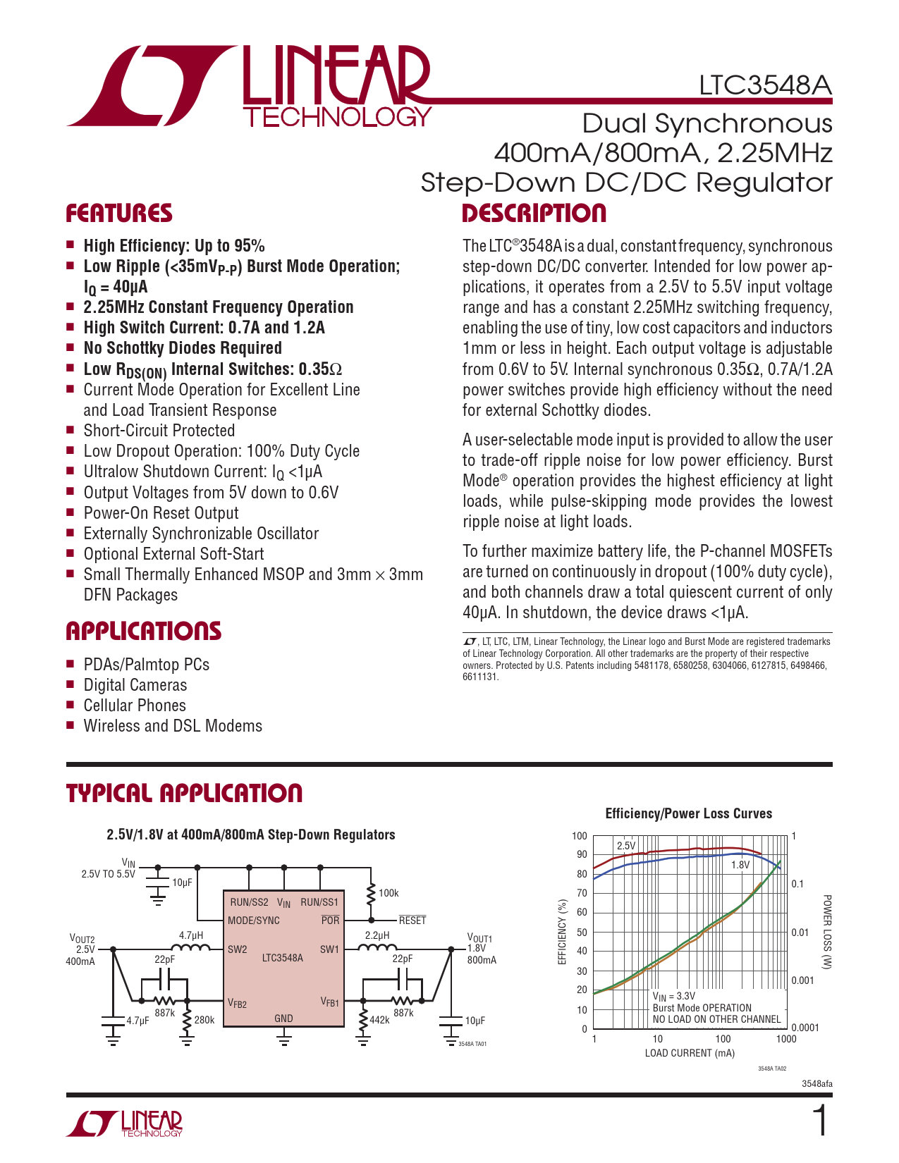 LTC3548A Dual Synchronous 400mA/800mA, 2.25MHz Step-Down DC/DC Regulator FEATURESDESCRIPTION n High Efficiency: Up to 95% The LTC®3548A is a dual, constant frequency, synchronous n Low Ripple (<35mVP-P) Burst Mode Operation; step-down DC/DC converter. Intended for low power ap- IQ = 40μA plications, it operates from a 2.5V to 5.5V input voltage n 2.25MHz Constant Frequency Operation range and has a constant 2.25MHz switching frequency, n High Switch Current: 0.7A and 1.2A enabling the use of tiny, low cost capacitors and inductors n No Schottky Diodes Required 1mm or less in height. Each output voltage is adjustable n Low RDS(ON) Internal Switches: 0.35 Ω from 0.6V to 5V. Internal synchronous 0.35Ω, 0.7A/1.2A n Current Mode Operation for Excellent Line power switches provide high efficiency without the need and Load Transient Response for external Schottky diodes. n Short-Circuit Protected A user-selectable mode input is provided to allow the user n Low Dropout Operation: 100% Duty Cycle to trade-off ripple noise for low power efficiency. Burst n Ultralow Shutdown Current: IQ <1μA Mode® operation provides the highest efficiency at light n Output Voltages from 5V down to 0.6V loads, while pulse-skipping mode provides the lowest n Power-On Reset Output ripple noise at light loads. n Externally Synchronizable Oscillator n Optional External Soft-Start To further maximize battery life, the P-channel MOSFETs n Small Thermally Enhanced MSOP and 3mm are turned on continuously in dropout (100% duty cycle), × 3mm DFN Packages and both channels draw a total quiescent current of only 40μA. In shutdown, the device draws <1μA. APPLICATIONS L, LT, LTC, LTM, Linear Technology, the Linear logo and Burst Mode are registered trademarks of Linear Technology Corporation. All other trademarks are the property of their respective n PDAs/Palmtop PCs owners. Protected by U.S. Patents including 5481178, 6580258, 6304066, 6127815, 6498466, n 6611131. Digital Cameras n Cellular Phones n Wireless and DSL Modems TYPICAL APPLICATIONEfficiency/Power Loss Curves2.5V/1.8V at 400mA/800mA Step-Down Regulators 100 1 2.5V 90 VIN 1.8V 2.5V TO 5.5V 80 10μF 0.1 100k POWER LOSS (W) 70 RUN/SS2 VIN RUN/SS1 60 MODE/SYNC POR RESET 50 0.01 V 4.7μH 2.2μH OUT2 VOUT1 2.5V SW2 SW1 1.8V 40 400mA 22pF LTC3548A 22pF 800mA EFFICIENCY (%) 30 0.001 20 V V V IN = 3.3V FB2 FB1 Burst Mode OPERATION 887k 887k 10 4.7μF 280k GND 442k 10μF NO LOAD ON OTHER CHANNEL 0 0.0001 1 10 100 1000 3548A TA01 LOAD CURRENT (mA) 3548A TA02 3548afa 1